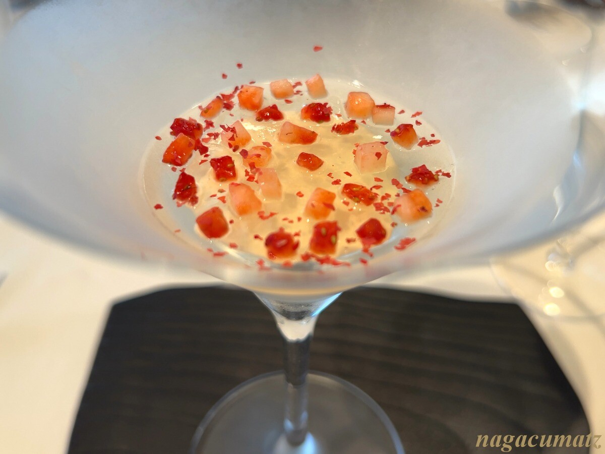 ブッラータチーズには、トマトのジュレと苺