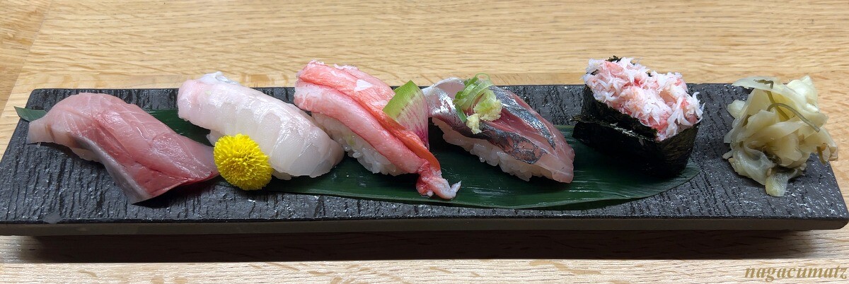 中列左から:蟹、鰆、信州サーモン、ヒラメのえんがわ