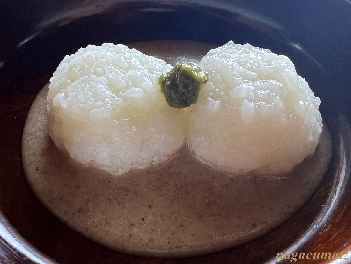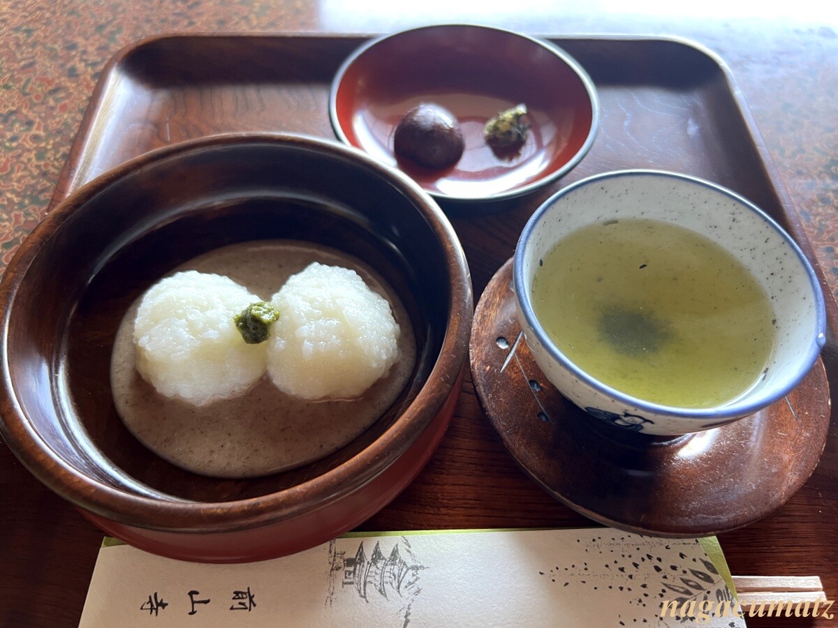 昭和30年代、住職夫人手作りの「くるみおはぎ」を檀家の方に接待していたのが始まりで、昭和50年頃より一般に振る舞われるようになったのだそう。塩田産の餅米で作ったおはぎの下に、境内で採れる鬼胡桃のたれが敷かれ、梅のしそ巻き、お漬物とお茶が付く。