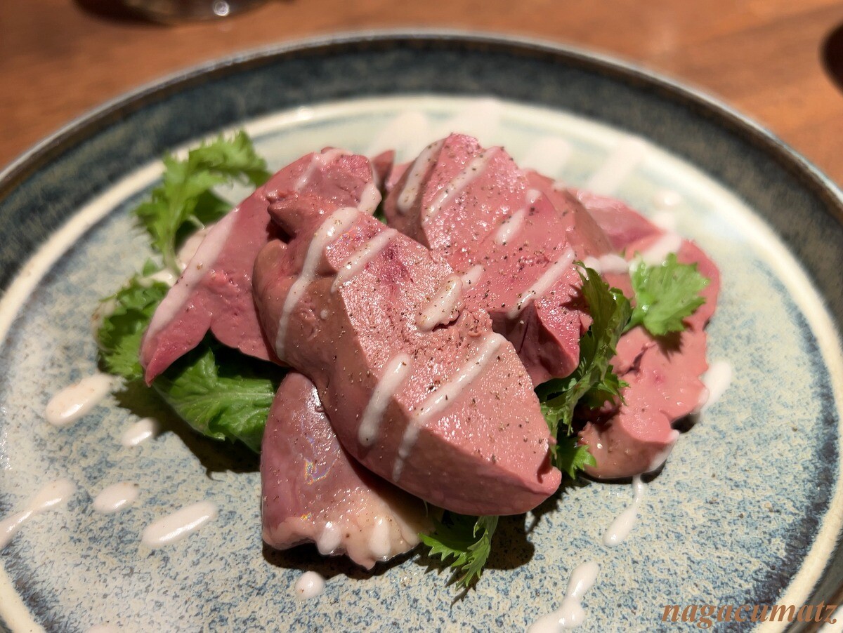冷たい鶏レバーのコンフィ 750円 定番メニューで、低温調理でしっとりしているとのこと。なるほど、美味しい。