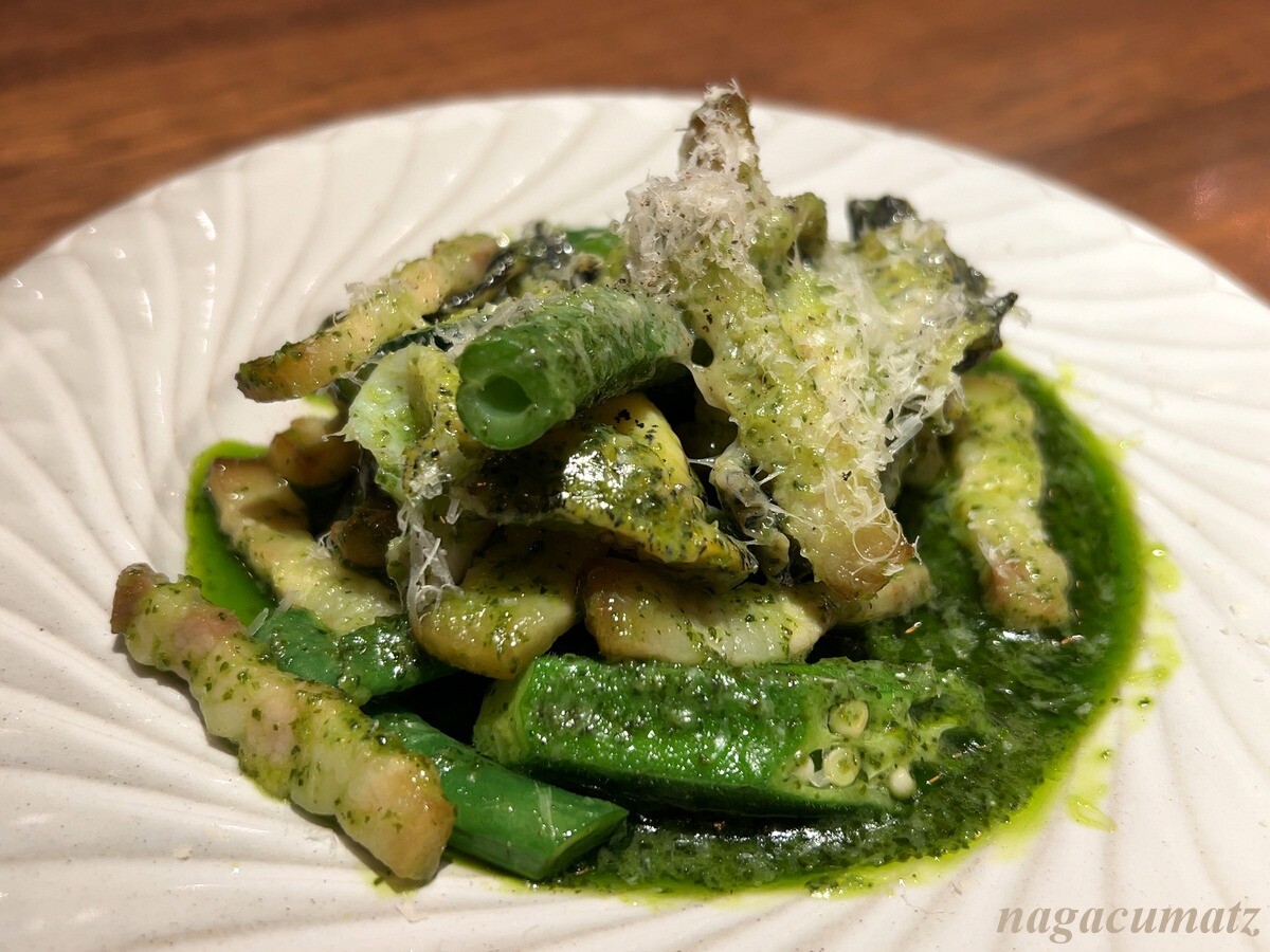 つぶ貝、春の緑野菜、ベーコンの香草バターソテー 1600円 画像ではうまく撮れていないが、大きなつぶ貝がゴロンゴロンと。