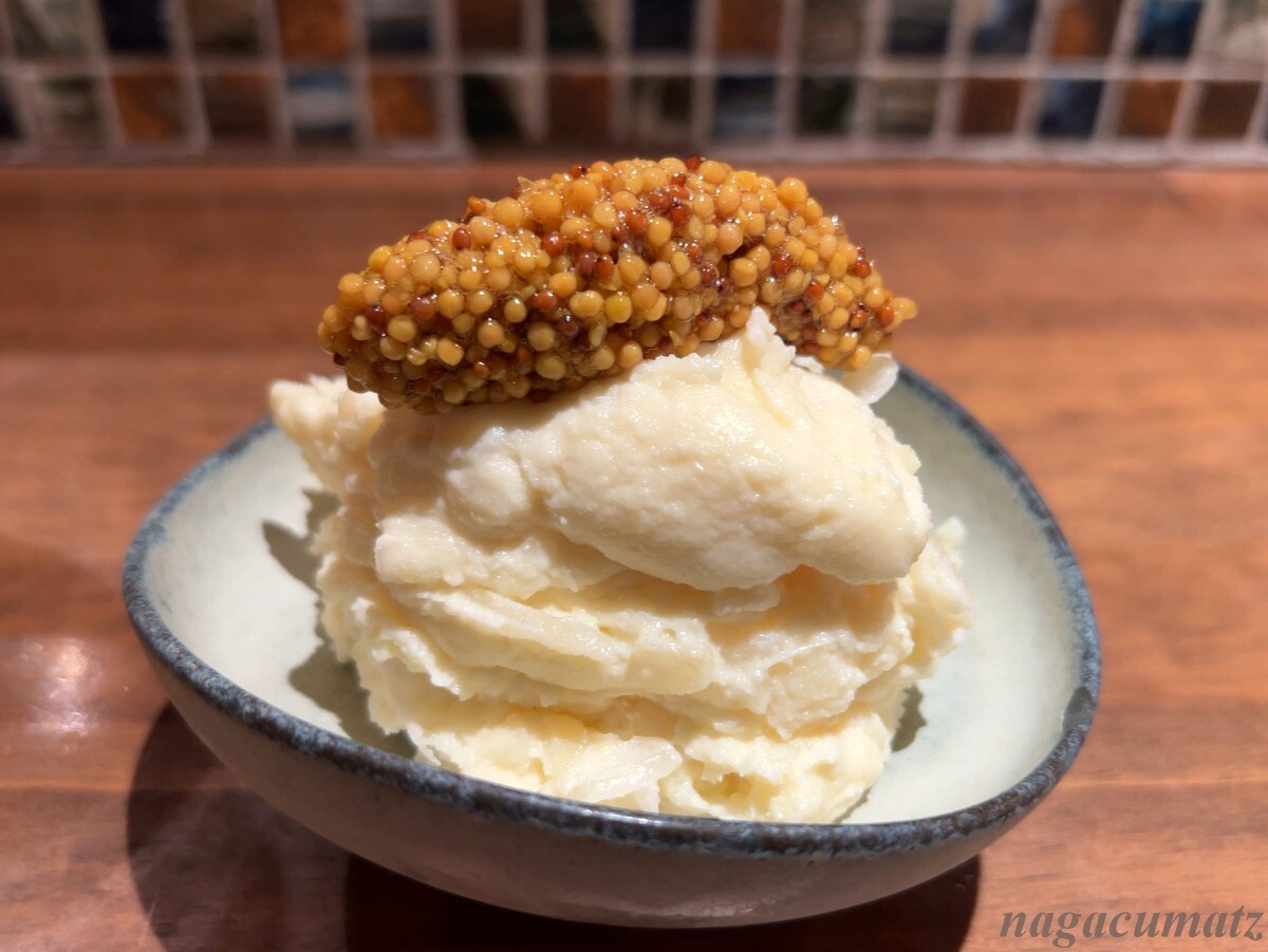 燻製ポテトサラダ、自家製粒マスタードのせ 750円 クリーミーなポテトの中には刻んだいぶりがっこが入っている。マスタードも美味しい。