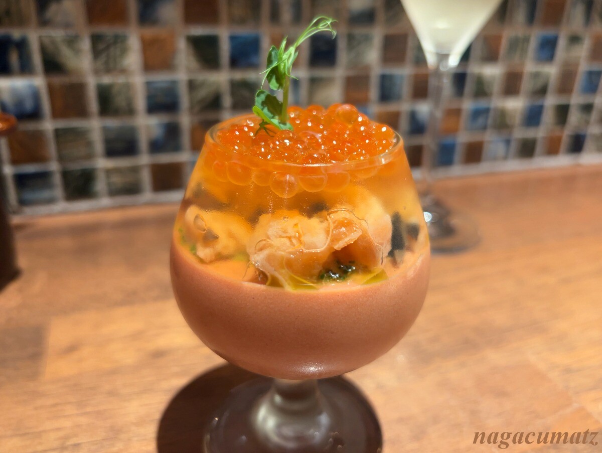フルーツトマトのムース、バジル、キングサーモン、トマトのコンソメジュレ、イクラが入っていて、限定9食 1300円。とても美味しく、このお値段にもビックリ。