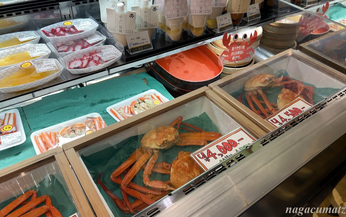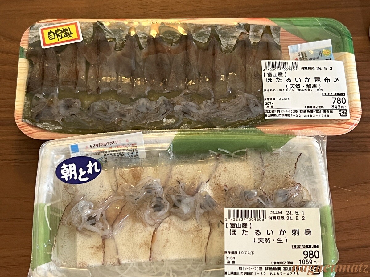 富山市のスーパーマーケットは、さすがに新鮮な魚介類だらけ。富山では、若いブリを「がんどぶり」と言うとのこと。