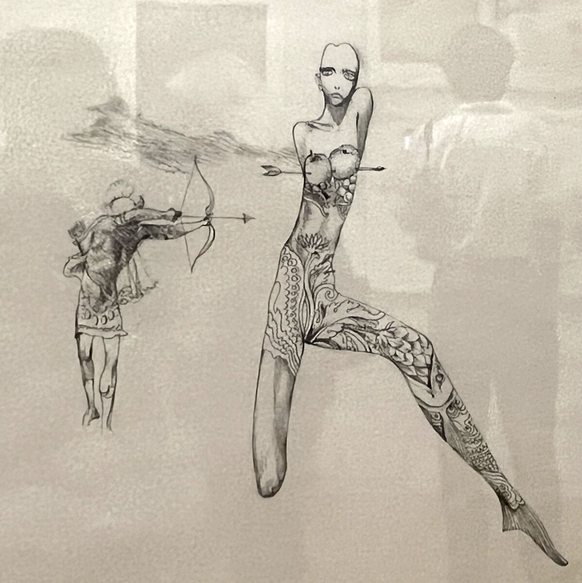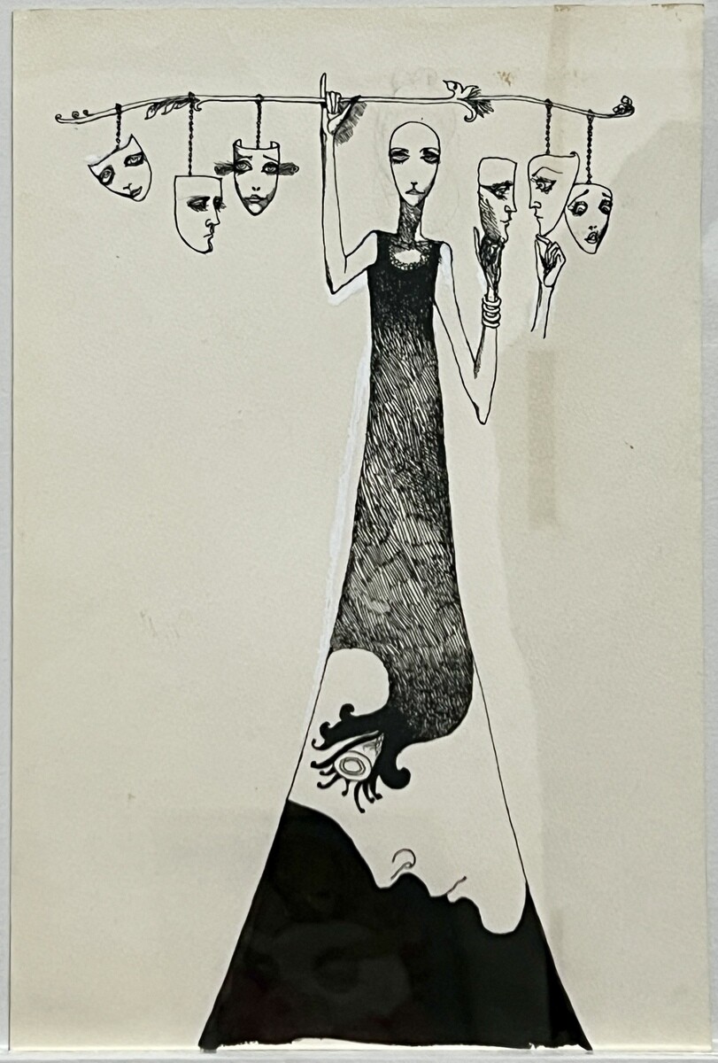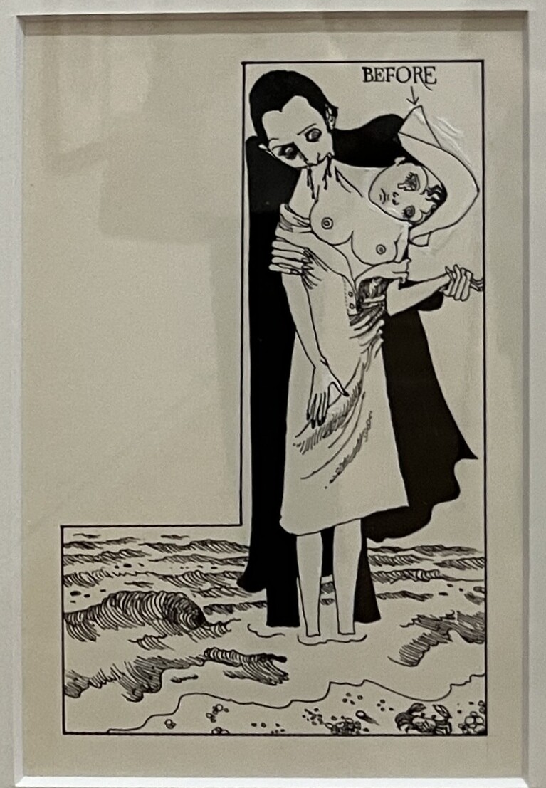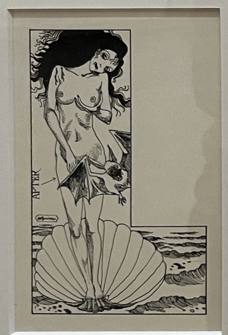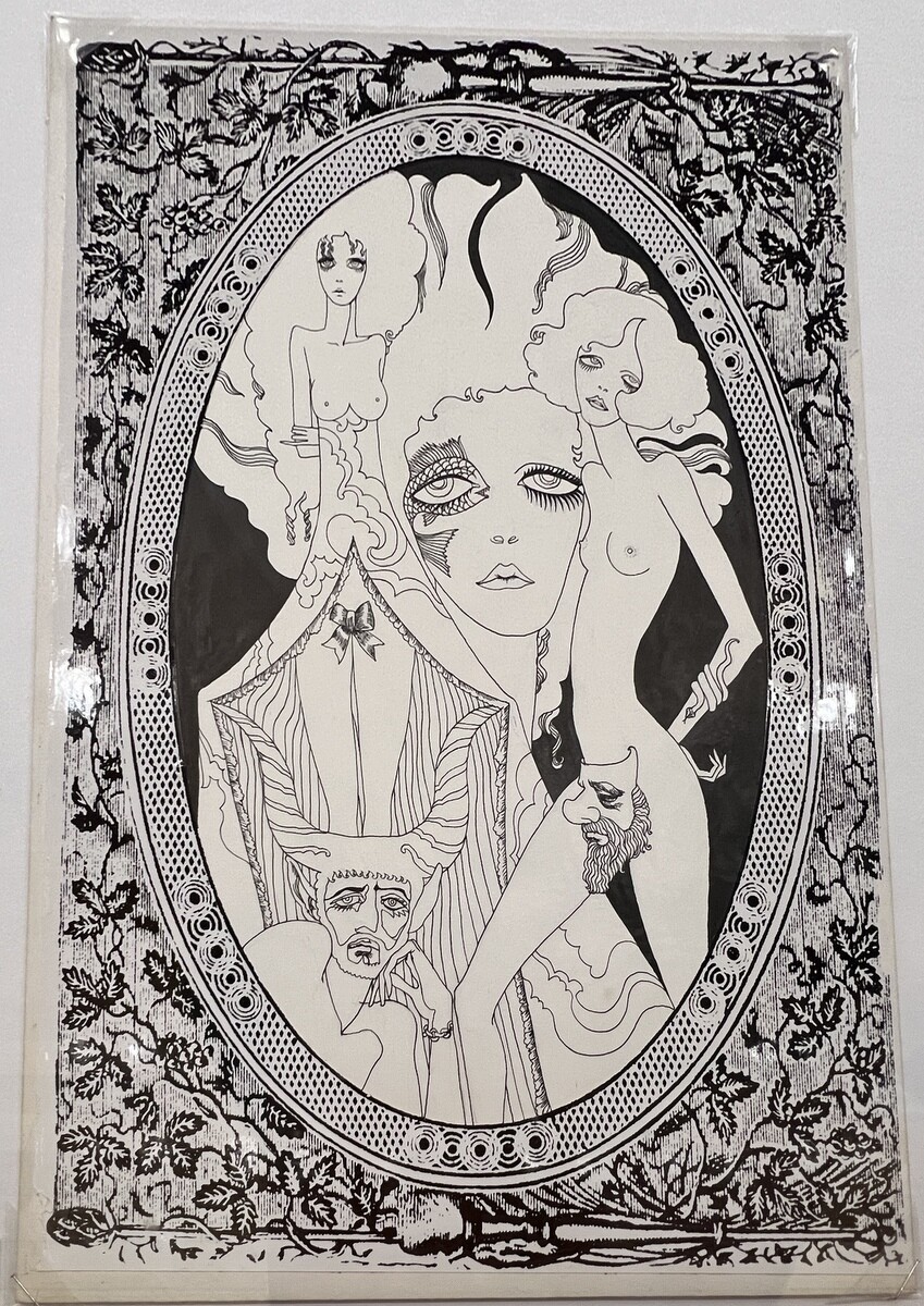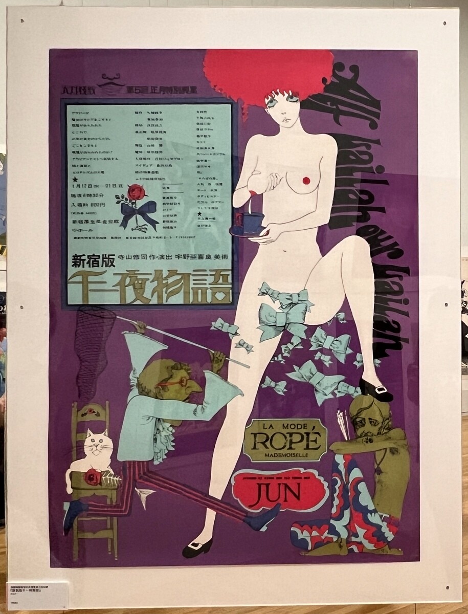 宇野氏が、寺山氏の為に初めて手掛けたポスター。台本が未だ出来ていない状態の時に宇野氏が描いた為、寺山修司氏が面白がって、実際の演劇で脇の下にミルクをはさんで胸からミルクを出すような演出をしたのだそう。ポスターは街に貼られたりするので、規制があってアンダーヘアーは描けない時代の為、そこにリボンのような蝶々を散らし、それを男性が追いかけている。