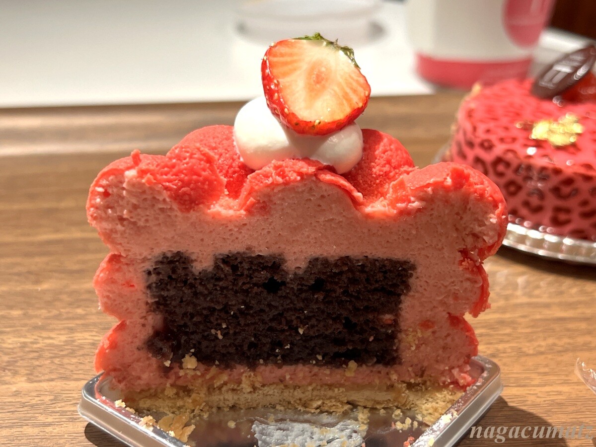 ピンクのヒョウ柄の定番ケーキ。苺とホワイトチョコレートのムースが美味。