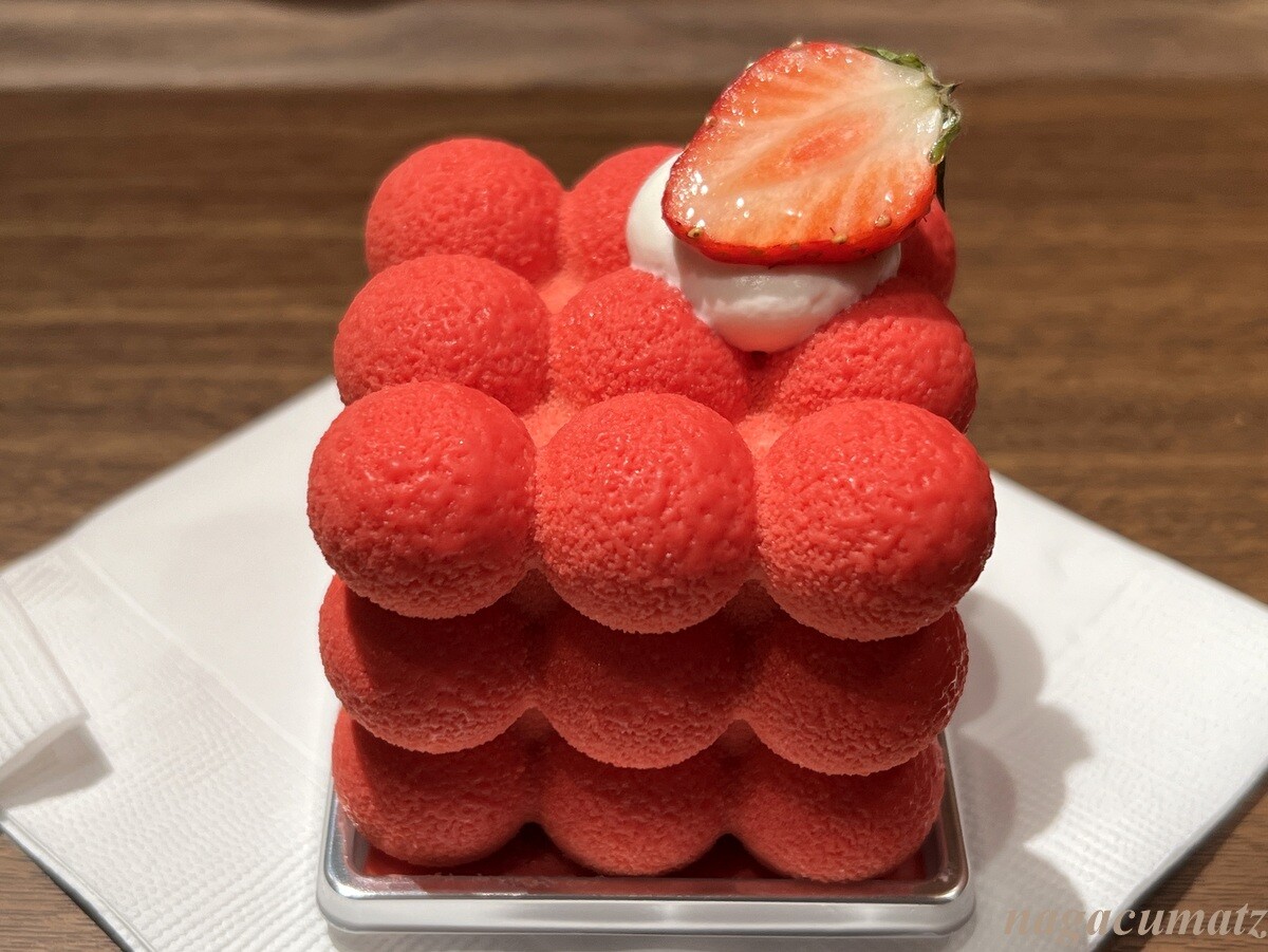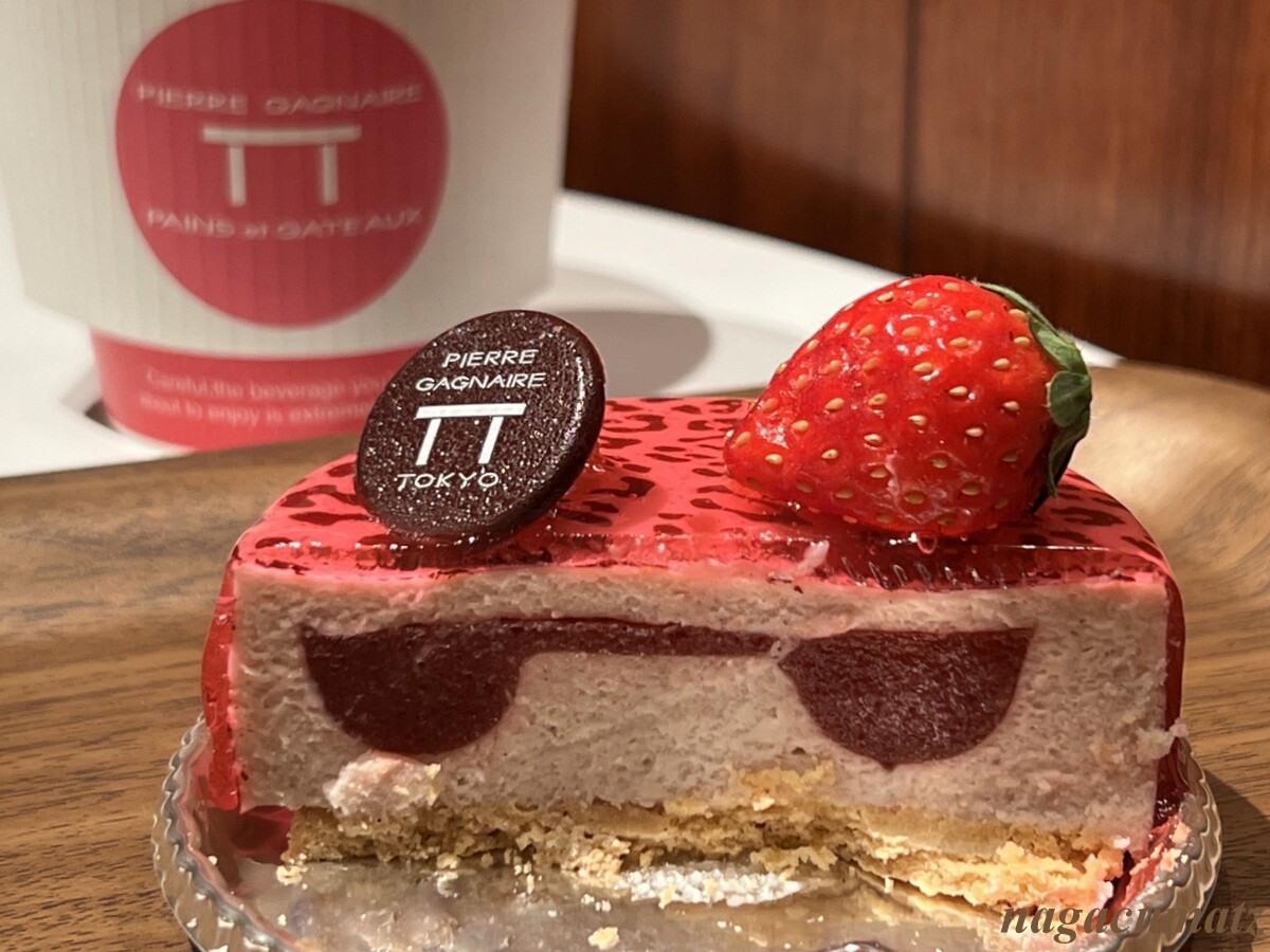 ストロベリームースの中に、チョコレートスポンジでサンドした野苺のコンフィチュールが入り、ストロベリー風味のチョコレートでコーティングされている。美味しい。