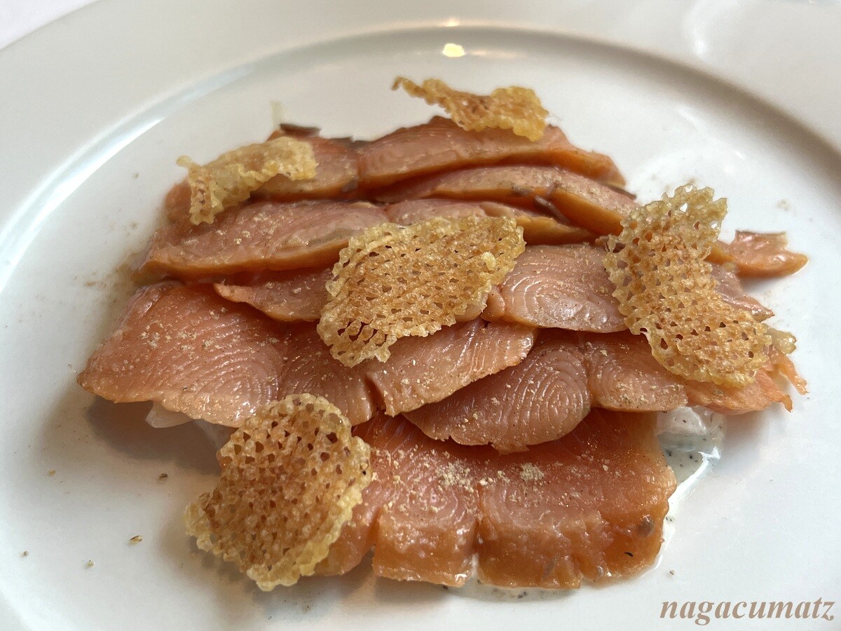 北海道本マスの自家燻製炙り 新たまねぎのサラダと。