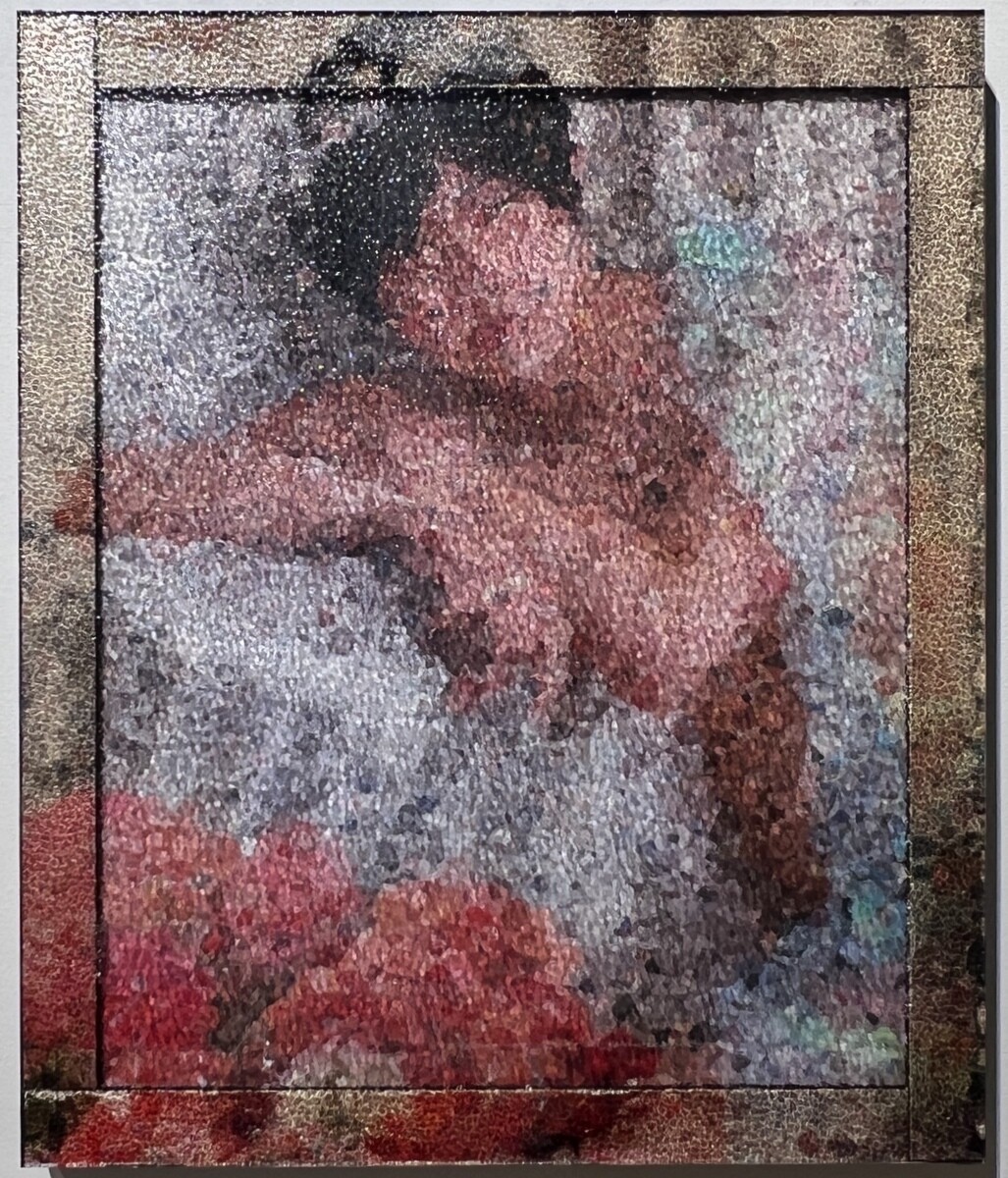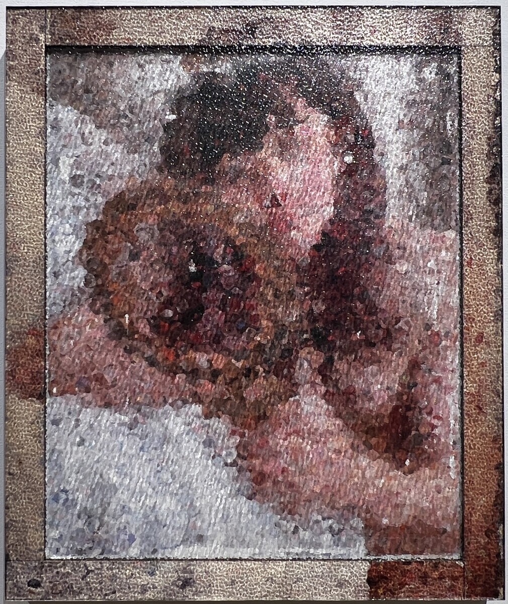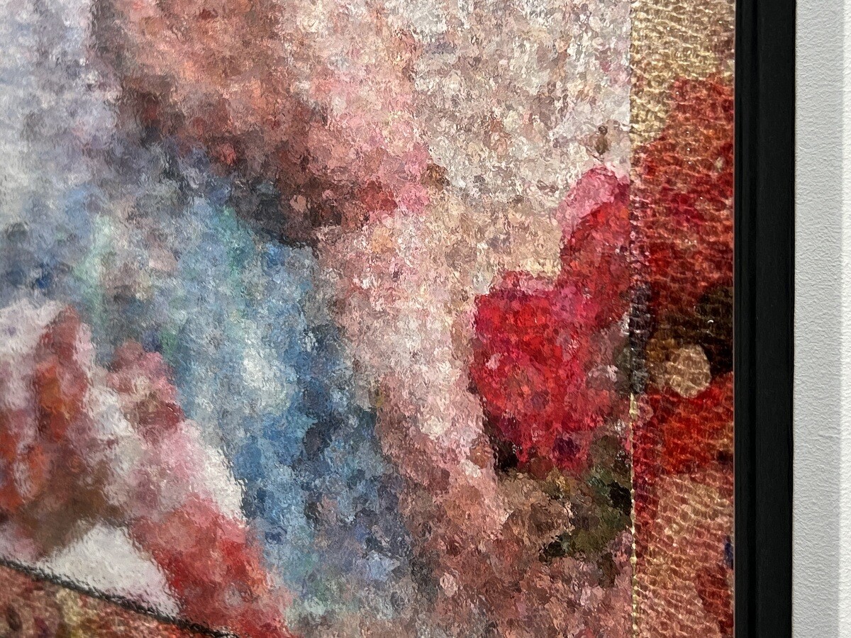 石やガラス、貝殻などの小片を寄せ合わせてつくる古典的モザイク・装飾美術技法ではなく、写真の転写に始まりブロックノイズや低解像度の画像など、デジタル技術を併用した作品を重ねるモザイク画を制作しておられる。