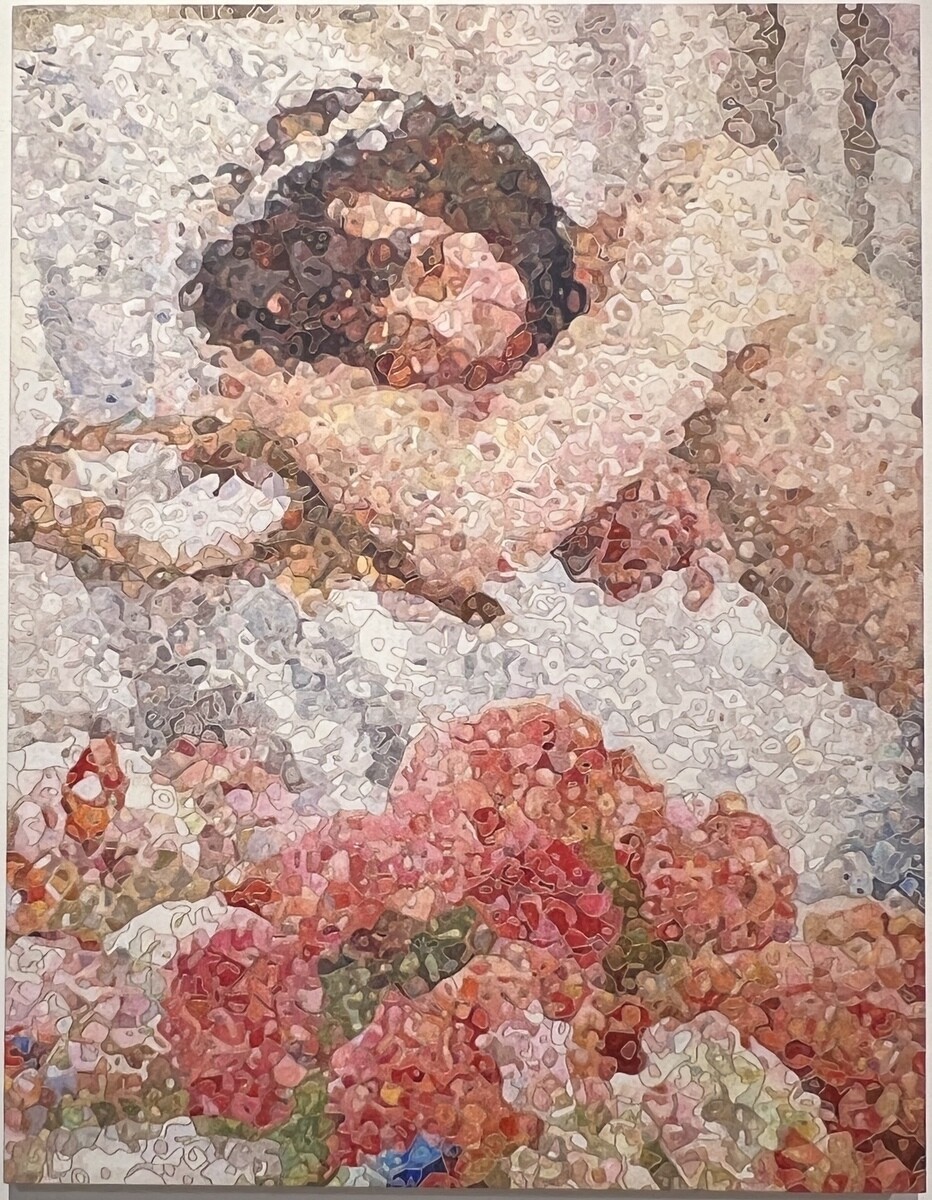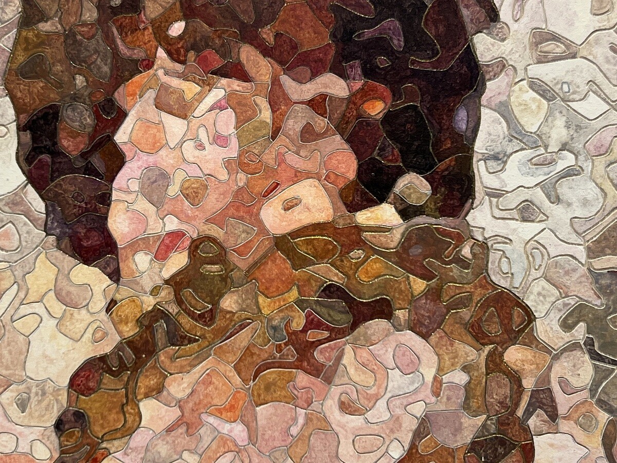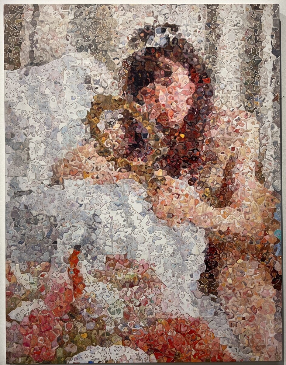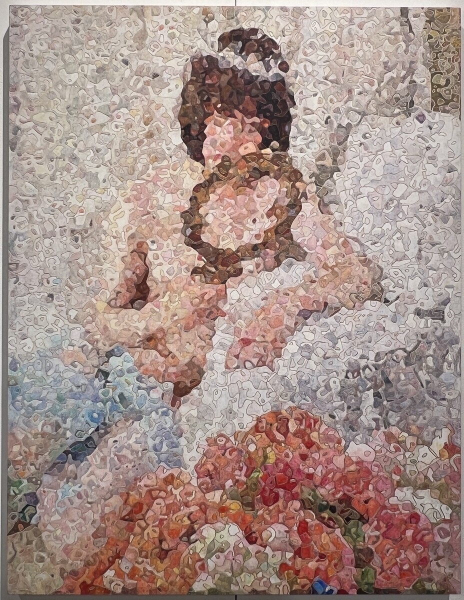 石やガラス、貝殻などの小片を寄せ合わせてつくる古典的モザイク・装飾美術技法ではなく、写真の転写に始まりブロックノイズや低解像度の画像など、デジタル技術を併用した作品を重ねるモザイク画を制作しておられる。