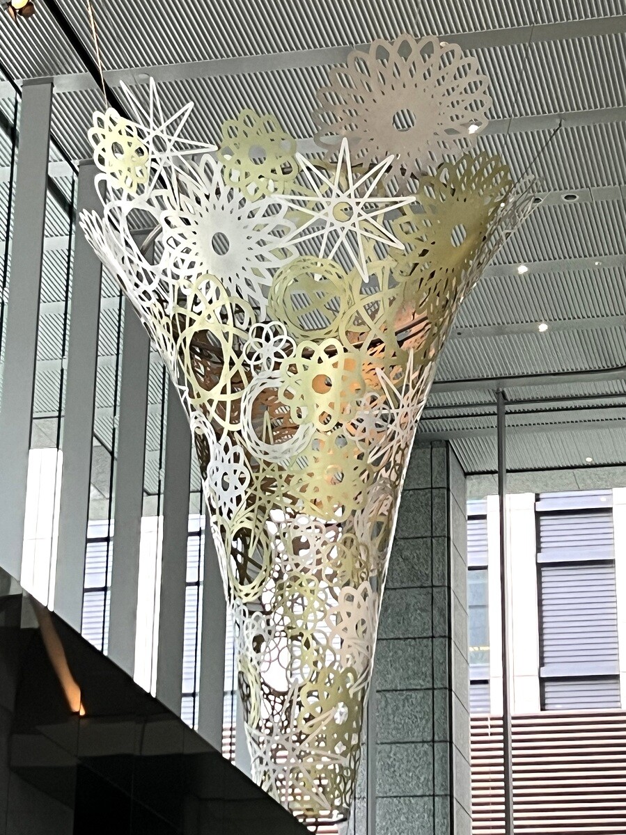 2024年07月21日 パブリックアート 渋谷清道 @ 飯野ビル 渋谷清道氏の「12ヶ月の精霊たちが集うかがり火」。日本画出身の作家さんで、素材や伝統的なモチーフへのこだわりがおありとのこと。古典からの引用が多く、物語性があり、「12ヶ月の精霊たちが集うかがり火」というタイトルから、マルシャークの童話「森は生きている」からの引用だそう。スパイログラフの模様のオブジェがエントランス上にある。エントランスの上部分の床にその模様がグラフィックになっているそうだが、飯野ホールの上にあがらないと見えないのが残念💦にほんブログ村にほんブログ村 「アート鑑賞」カテゴリの最新記事 < 前の記事次の記事 > コメント コメントフォーム 名前 コメント 記事の評価 リセット リセット 顔 星 情報を記憶 コメントを投稿する