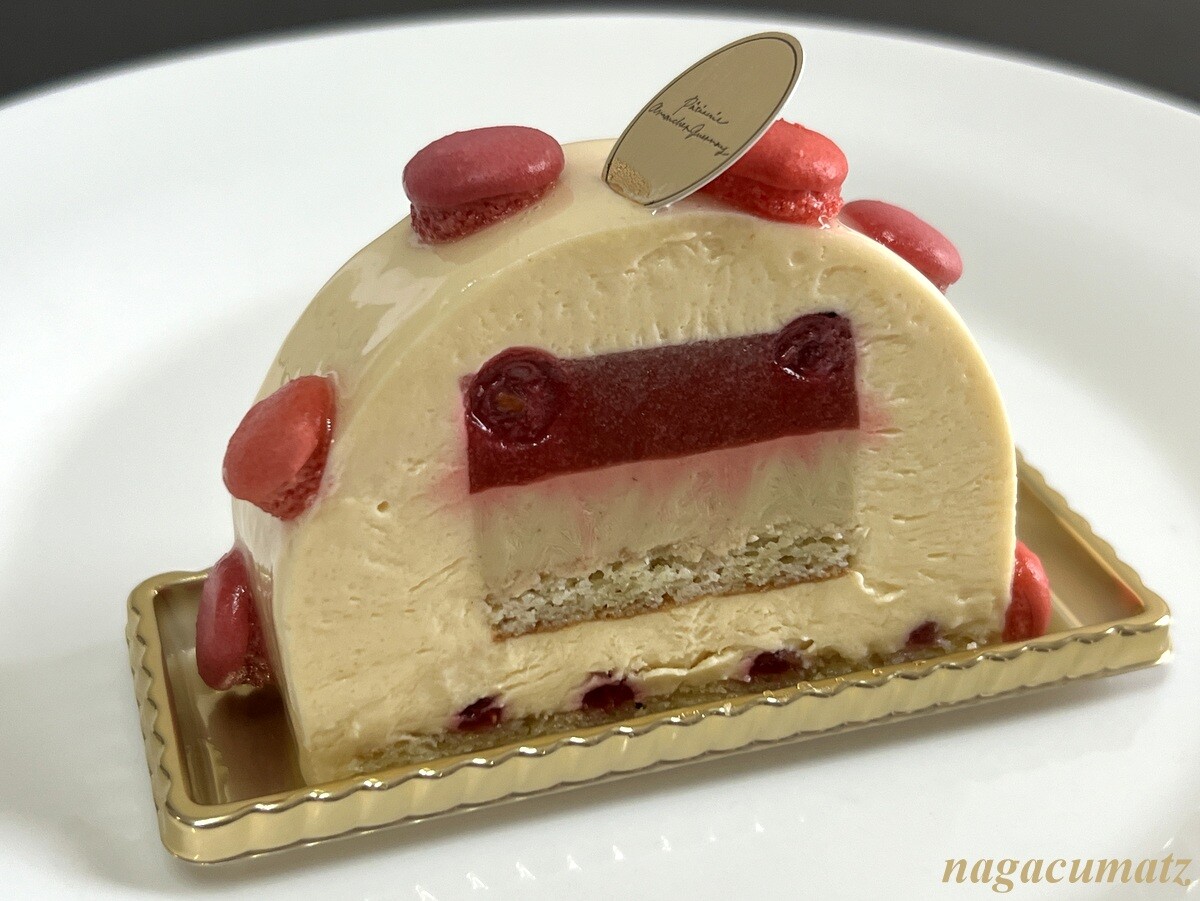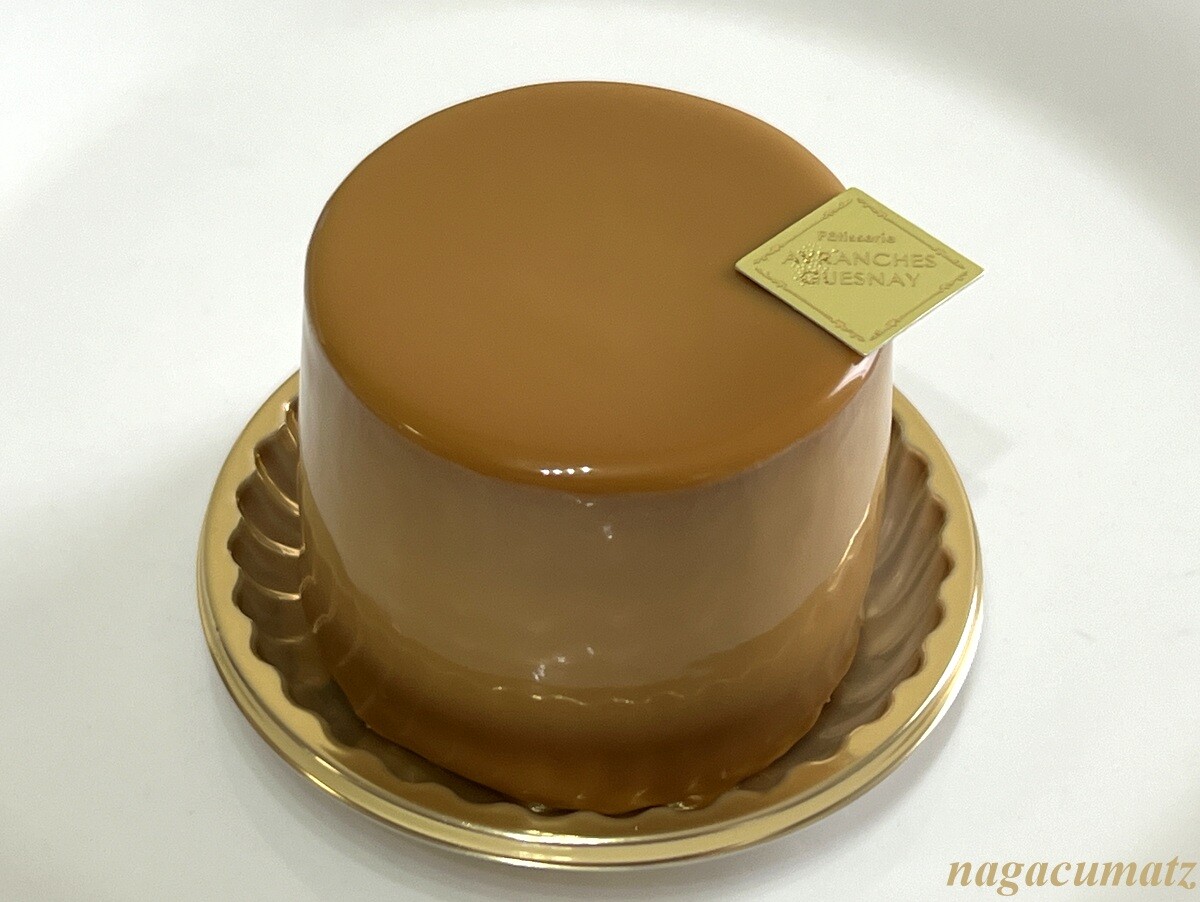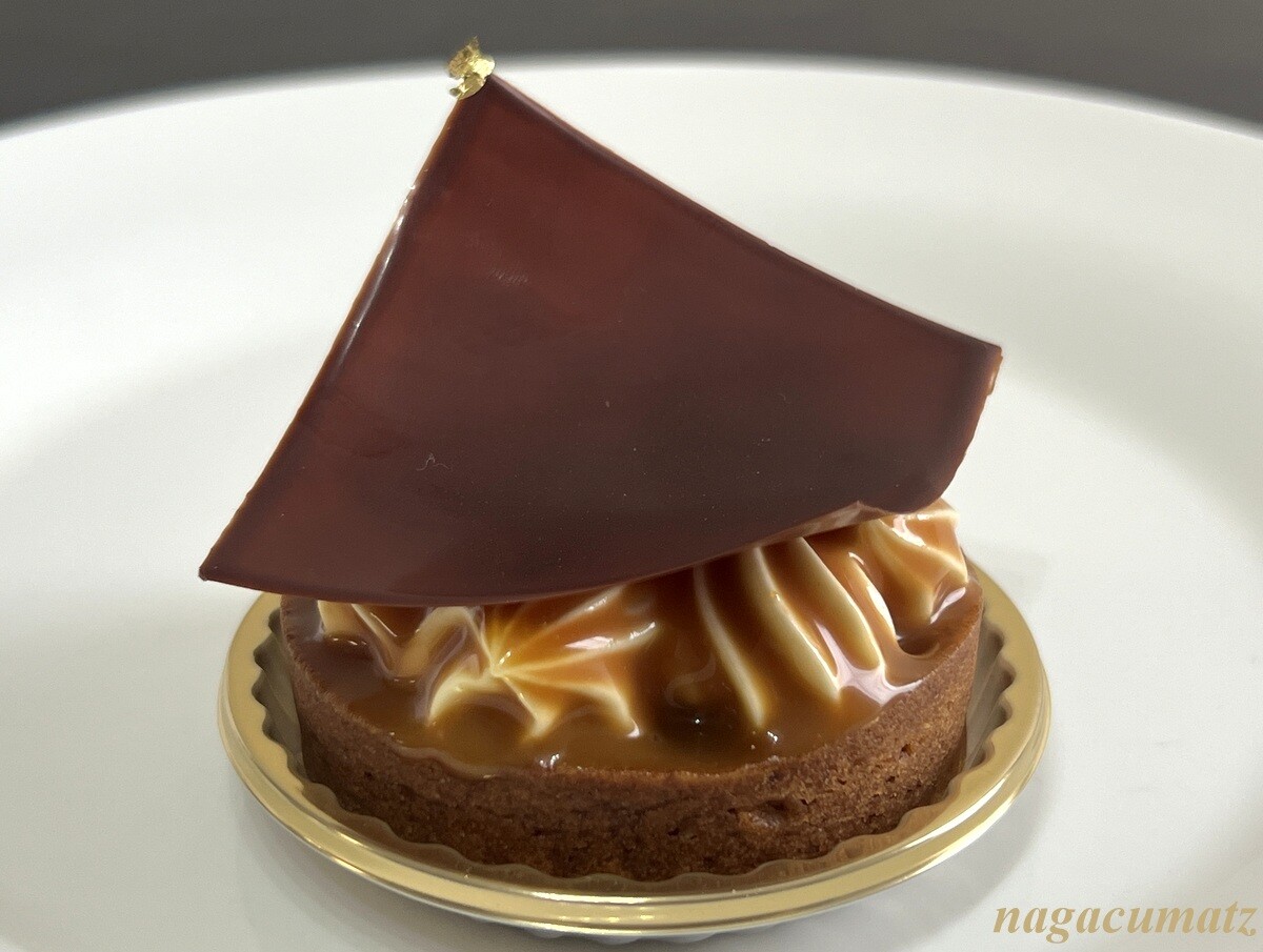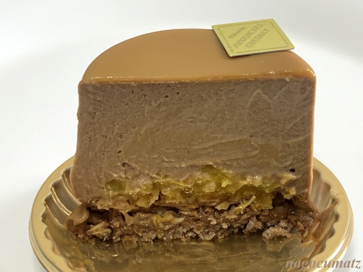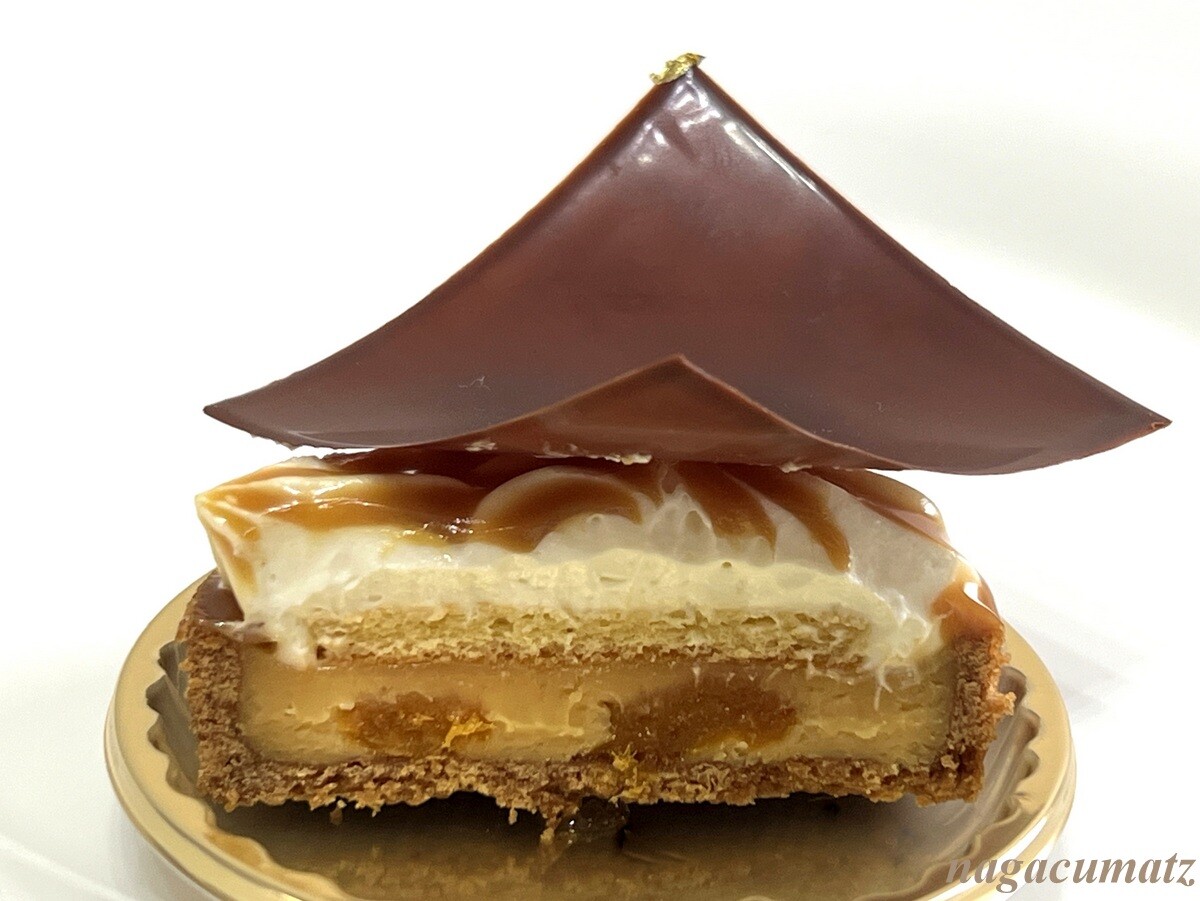 アーモンドスライスのサクサクした台の上に、オレンジのコンポート、そしてムースショコラオレとヘーゼルナッツクリームが載り、キャラメルでコーティングされている。滑らかながらしっかりしたお味で美味しい。
