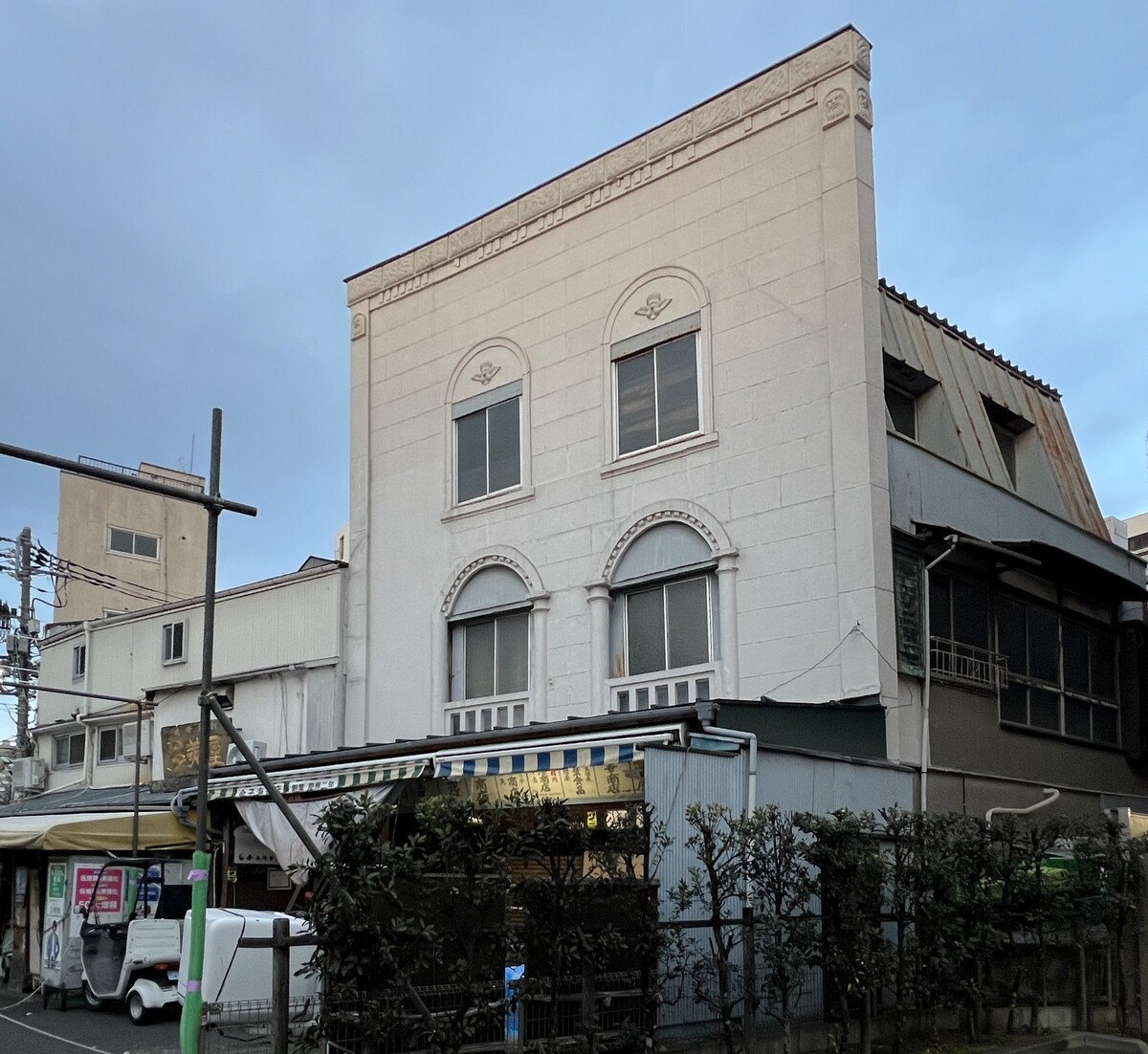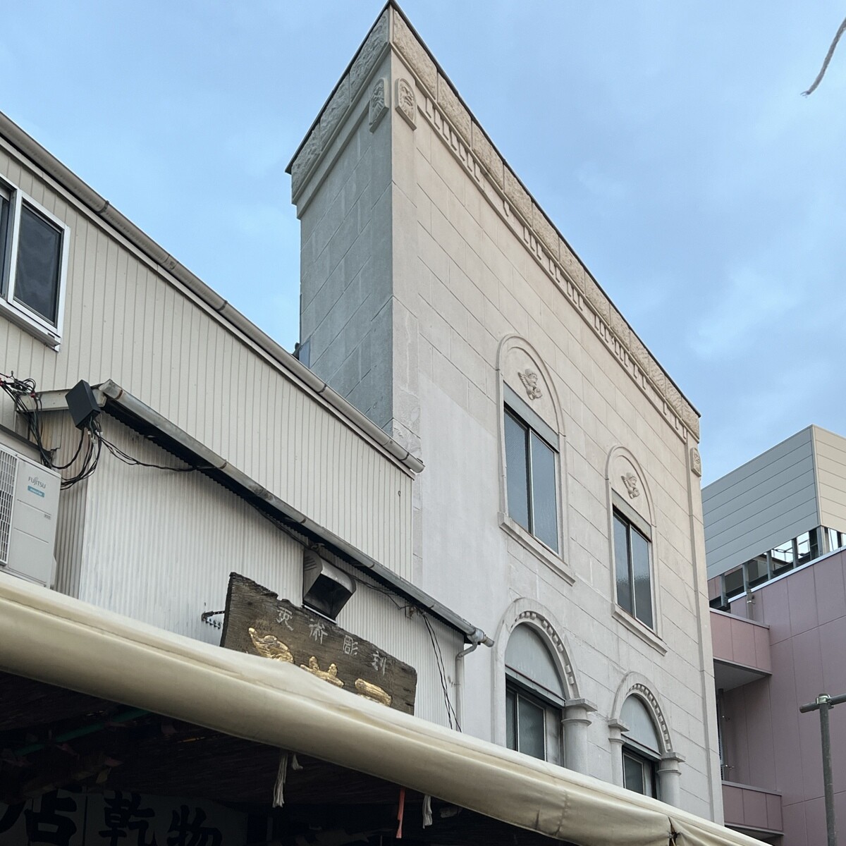 モルタル造りの正面には、石を積み上げたように描かれ、左右の柱には人の顔のレリーフがあるが、裏側は普通の木造建築の看板建築。関東大震災後、政府は被災した商店の復興を促すべく、建築物の規制を緩和し、商店主達は正面の外観だけでも立派にしようとし、それが看板建築につながっていく。少ない費用で立派に出来ると小さな商店に広がっていき、震災発生後から2ヶ月で商店が再開しだしたのだそう。