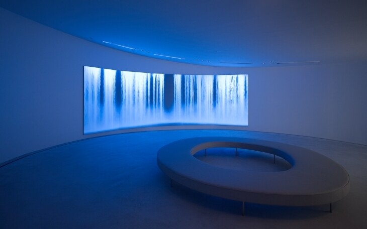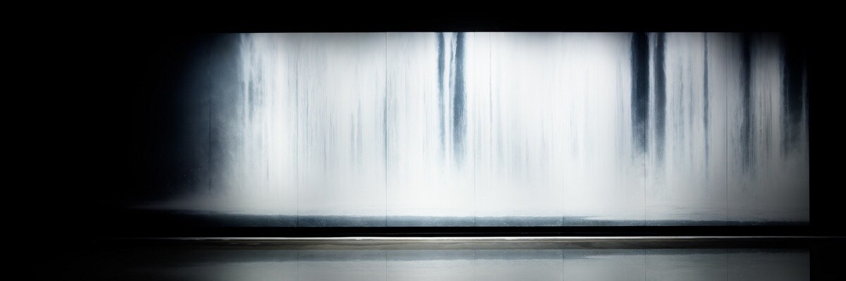 千住博氏曰く、美術は見えないものを見えるようにするものであり、滝を通して時の流れを描きたいと思ったとのこと。パネルに貼った黒い和紙に黒い顔料を塗り、画面を立てて、白い顔料を上から下へ流し、エアブラシで表情を付けていくという手法で描かれている。