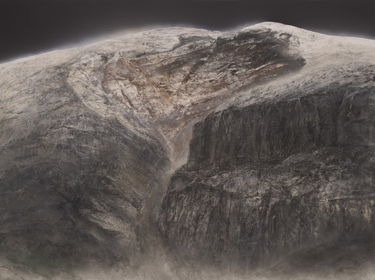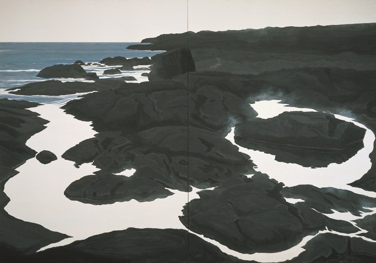 新しいモチーフを探すべく、ハワイ島でヘリコプターをチャーターして廻っていて、溶岩の上にヘリコプターが降りた時、未だ足元は温かい新しい出来立ての風景に遭遇。自然の水が湧き、鏡のように波ひとつ立たずに平らで、その水を絵に表現しようとした。が、日本画の岩絵の具だけでは光沢のある色は出ない為、チタニウムを混ぜて描いた。現地の石を拾って使ってもみたが上手くいかず、トリチウム(電気石)を使って描いているとのこと。