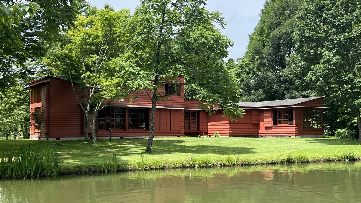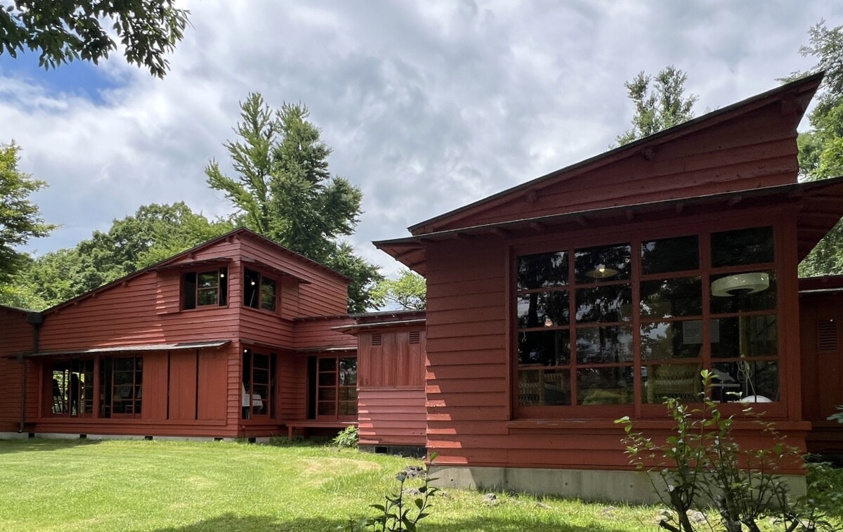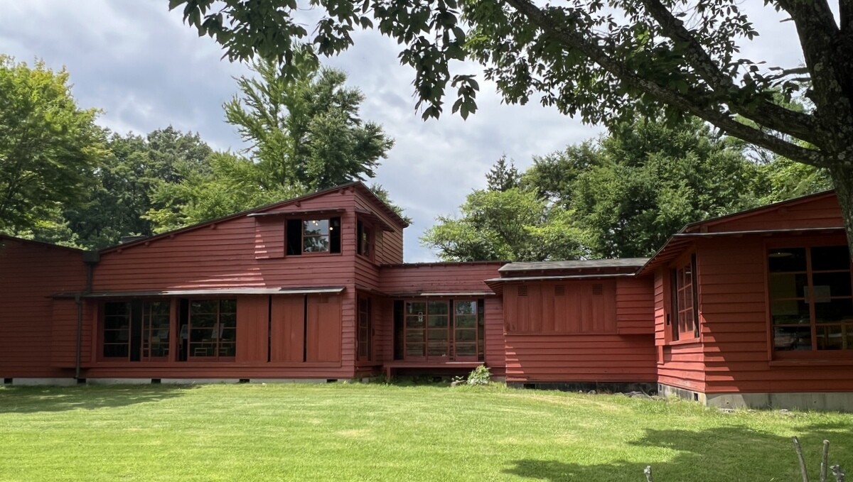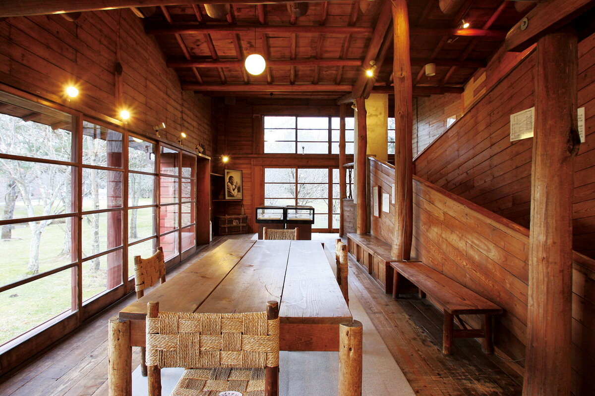 V字型屋根のモダンな建物は、日本民家に着想を得た構造や軽井沢の風土と調和する工夫がみられるが、一説には、師匠のフランク・ロイド・ライトのアイデアの登用とも。