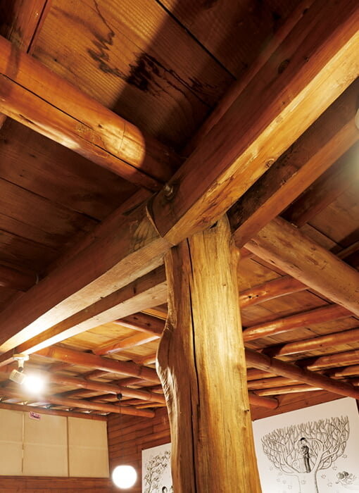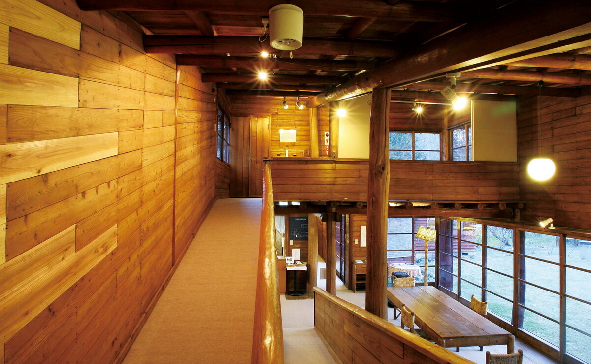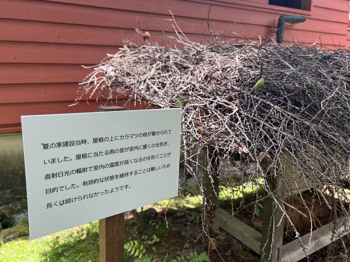 下見板張りの外壁や内装材は杉、節を残した丸太柱は栗、全ての屋根はカラマツの小枝で覆い、草葺きのようなにして断熱・防音を図っていたが、現在はされていない。