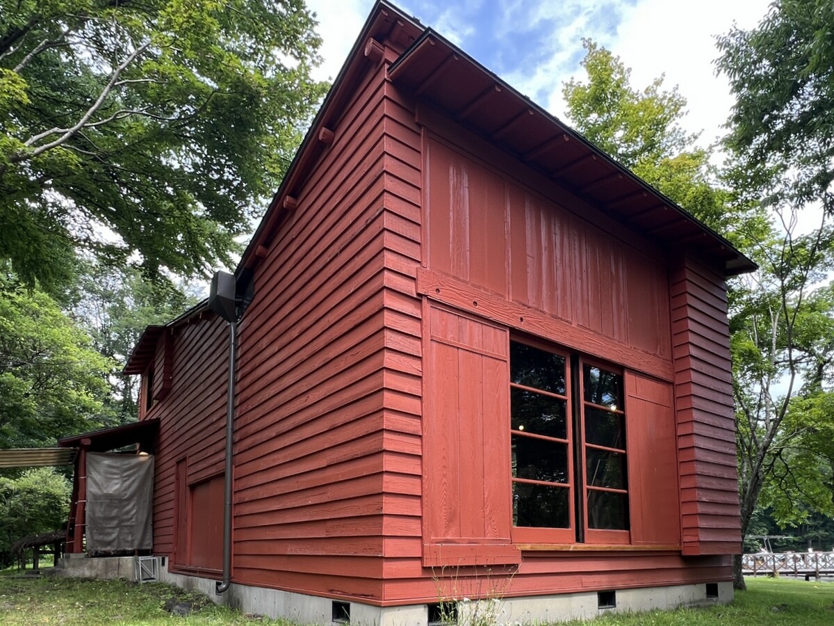 アントニン・レーモンド Antonin Raymond 氏の別荘兼スタジオとして、家族や設計事務所員とともに夏を過ごした建物で、昭和61年軽井沢タリアセン内へ移築(現ペイネ美術館)。