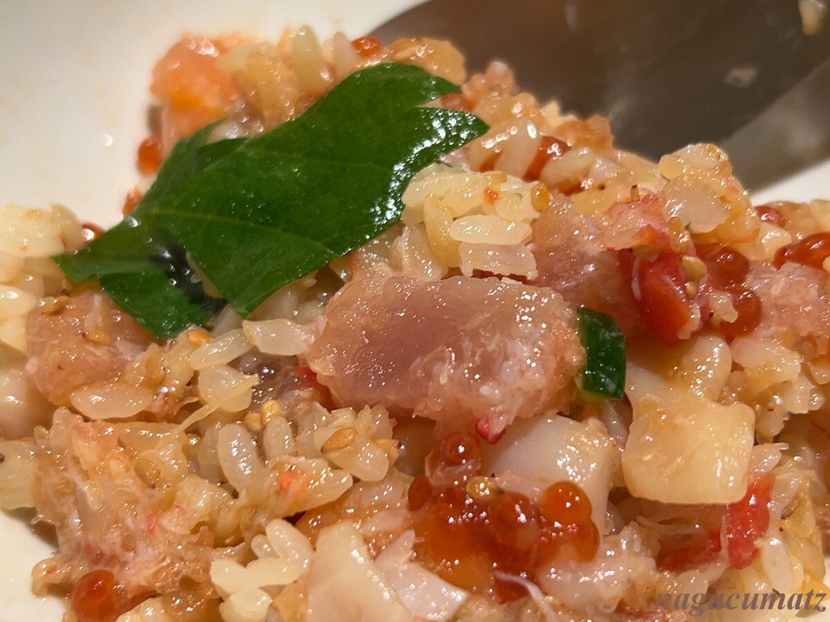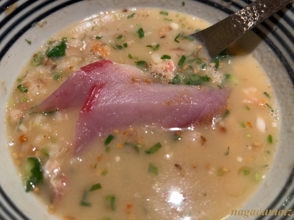 残りが3分の1ほどになったところで、板前さんに鯛だしを入れてもらい、残しておいたお刺身も入れる。だし入りもまた美味しい。