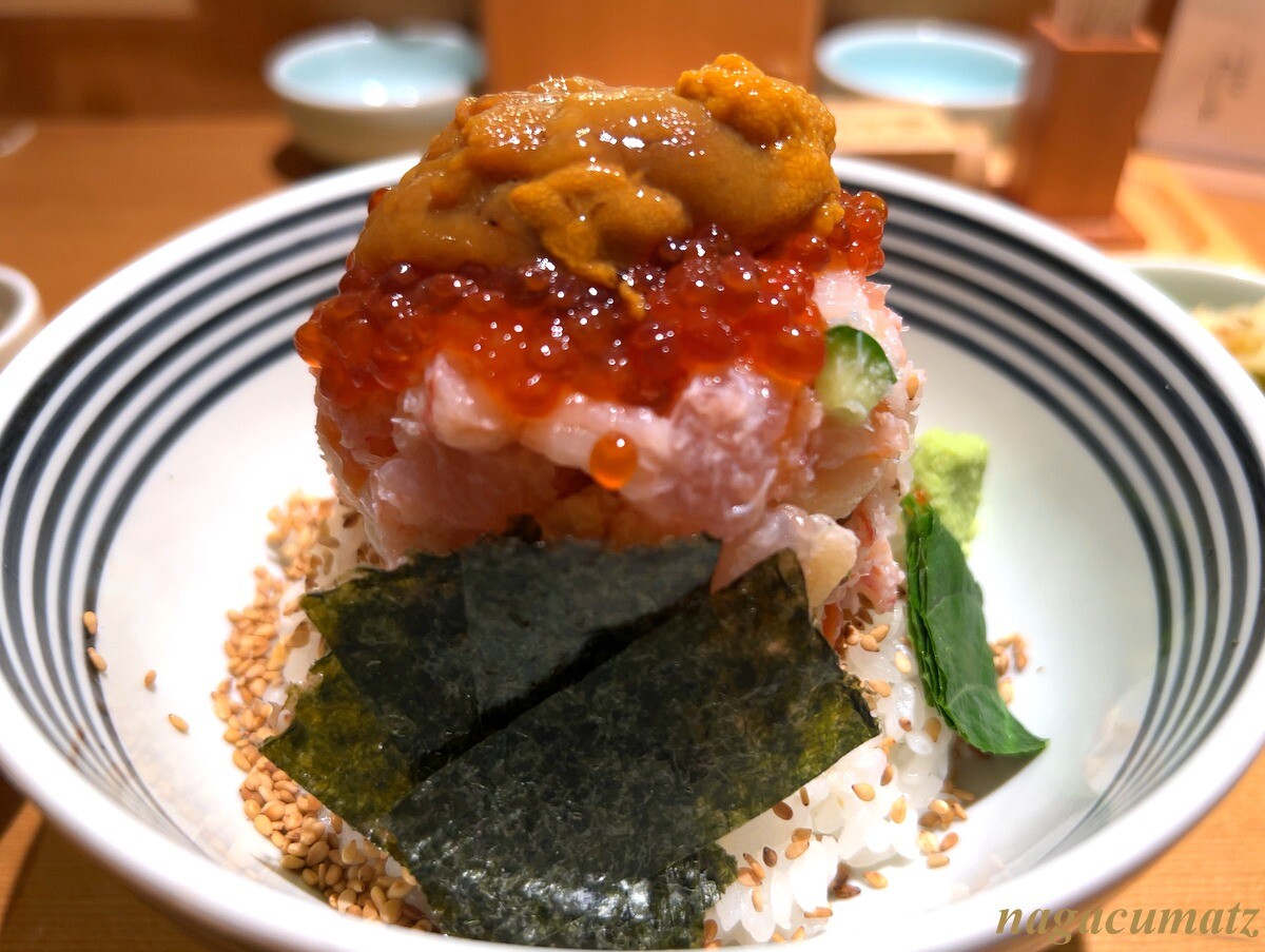 黄身醤油に山葵をといて、海鮮の山を崩してからかけるようにと。ご飯の量は少なめで依頼。美味しい。