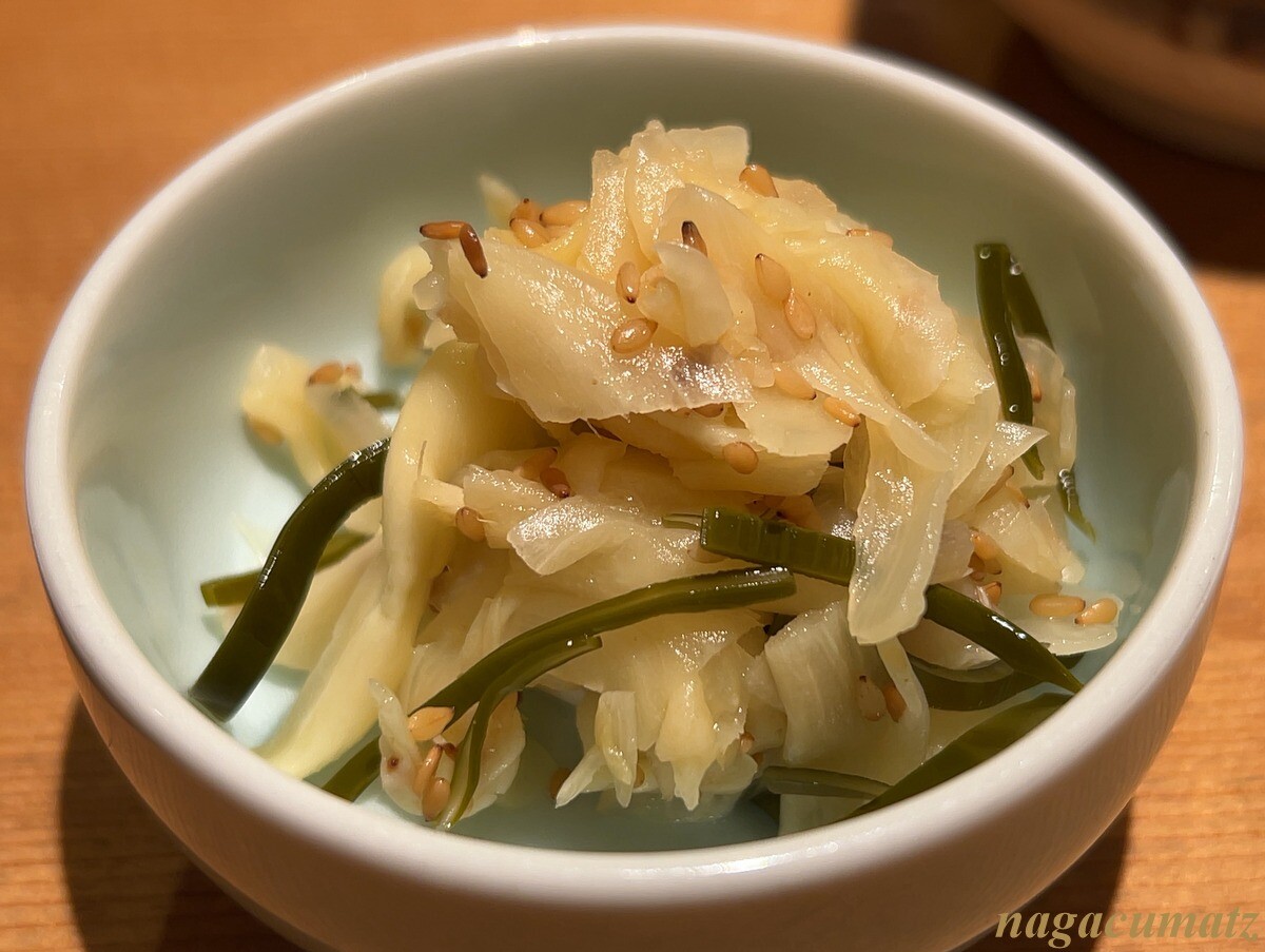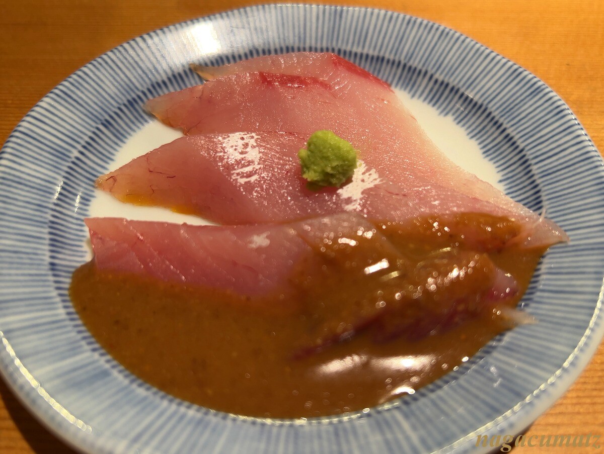 まず最初に、わらさのお刺身が味噌だれで出て来る。〆の鯛だし用に2切れ残しておくようにと。