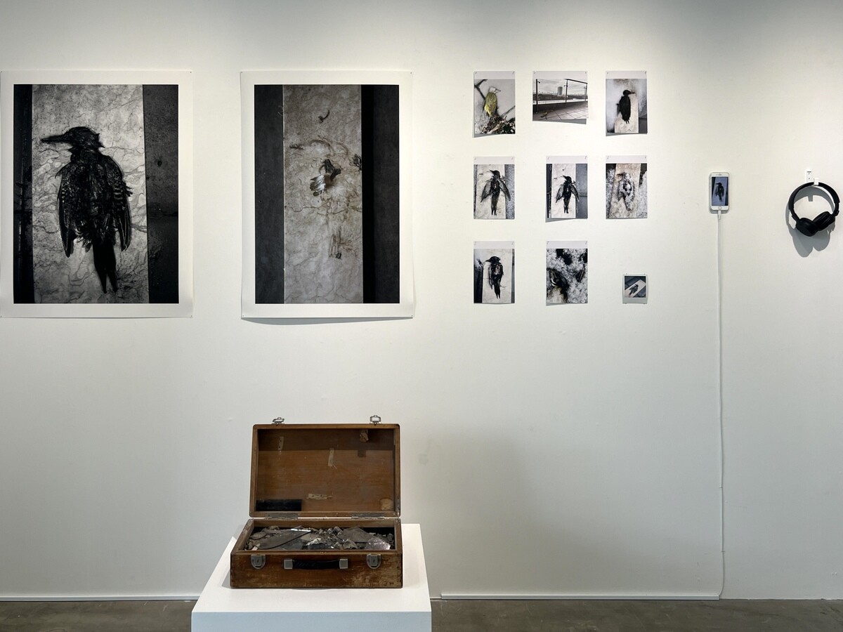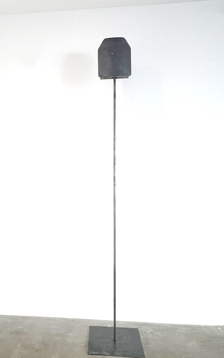銃弾の跡のある防弾服を用いたオブジェ。