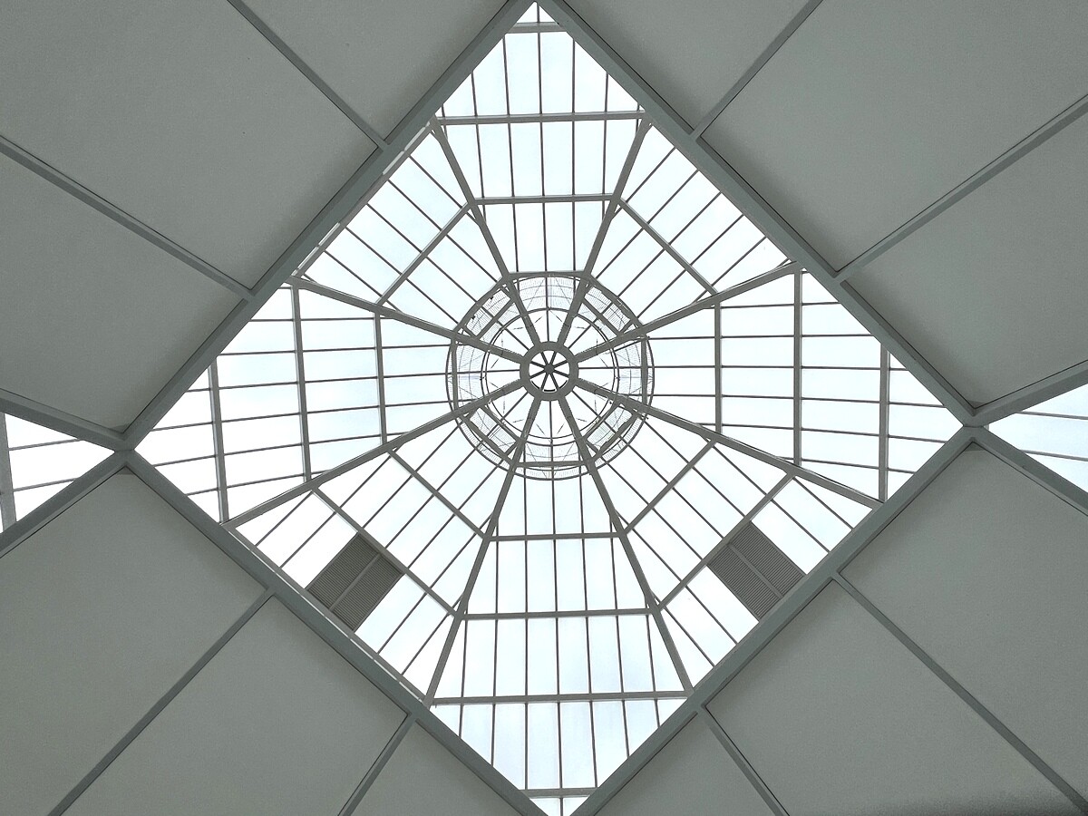 有名な水盤には、この日はいっぱい水が張ってなかったのが残念💧煙突効果で換気を促しているそうで、頂上部分にはガラス窓が一部空くようになっている。直径100メートルの水盤が3階で、その下の1階・2階が水族館。