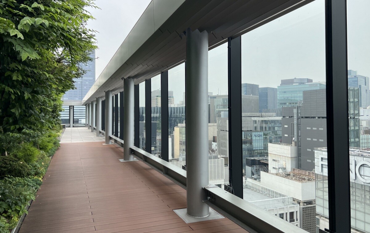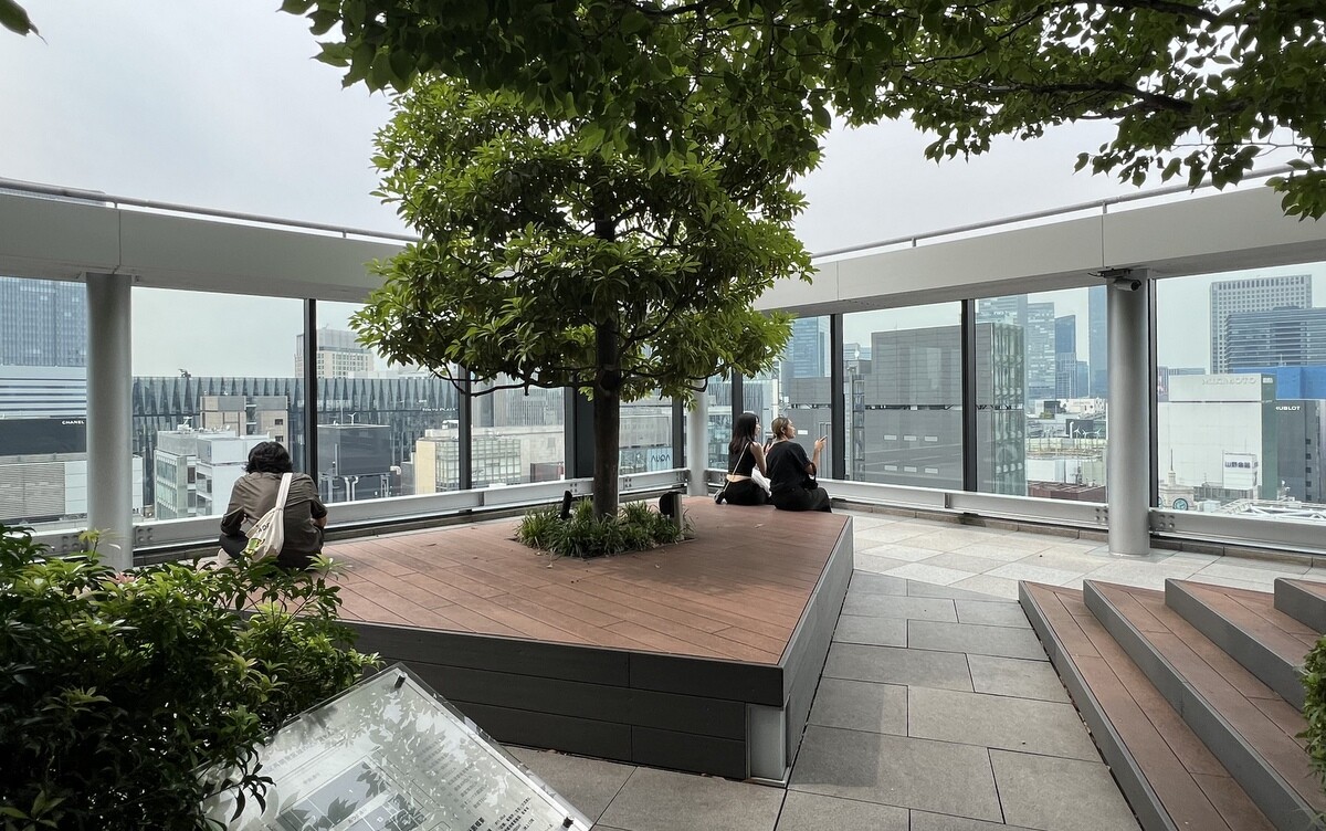 屋上を一周できるようになっていて、ベンチなどもあり、平日は会社員の方々がお昼を食べていたり、インバウンドの人達の休憩場所になっていたり。