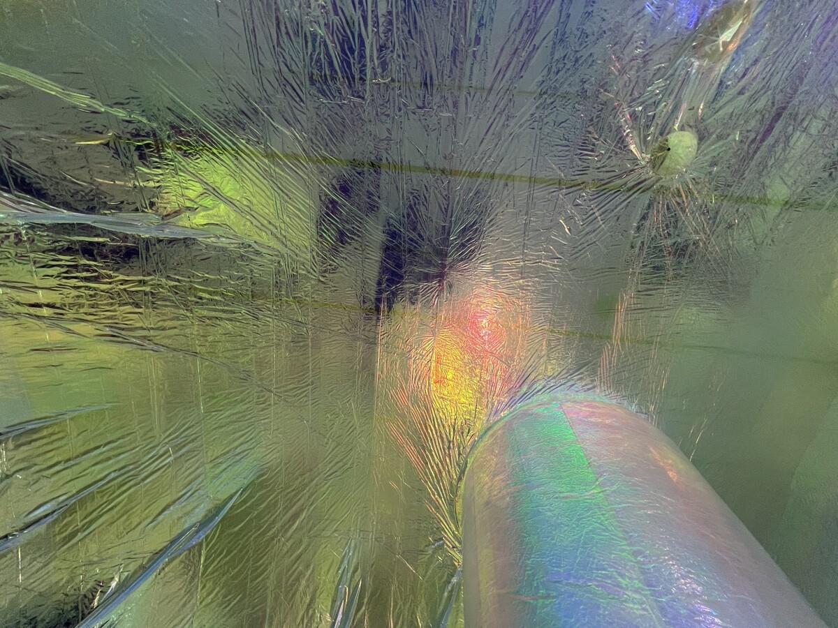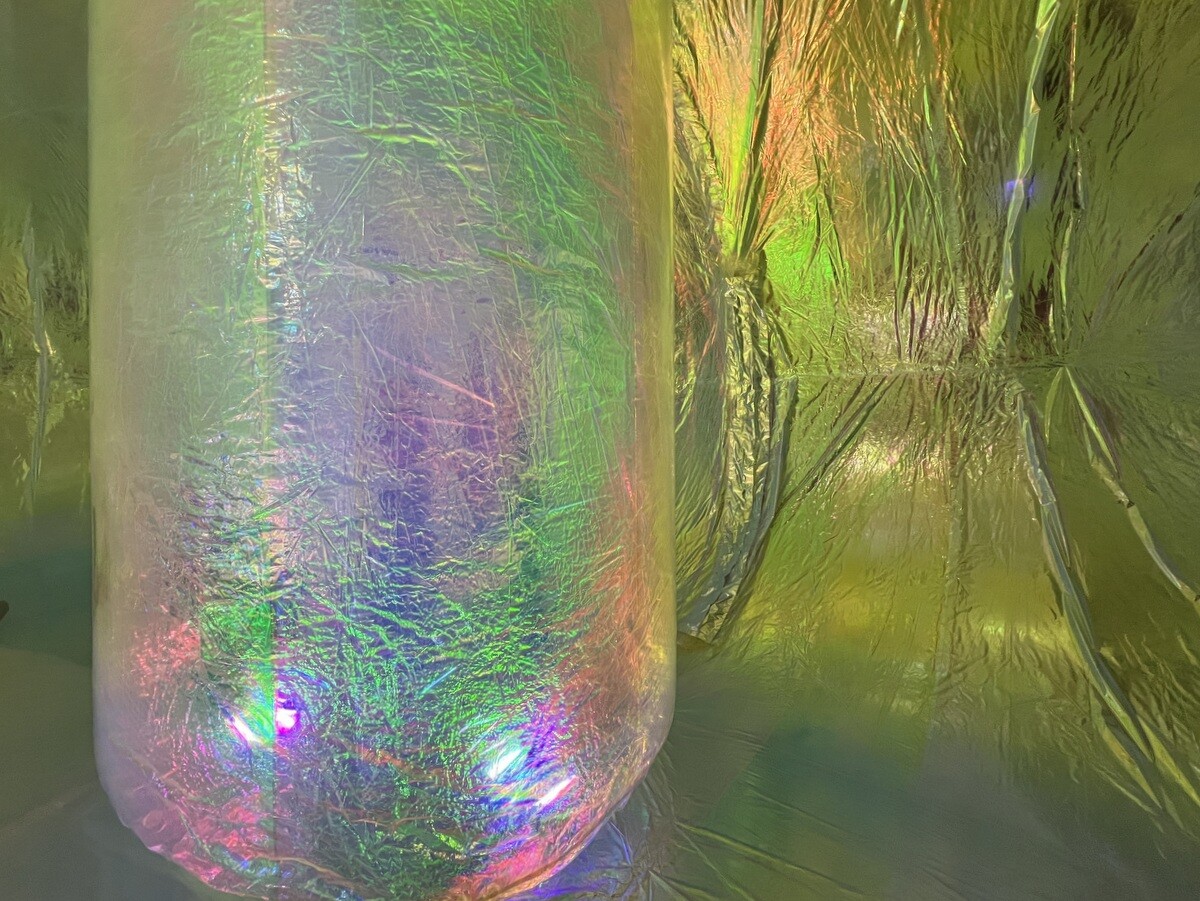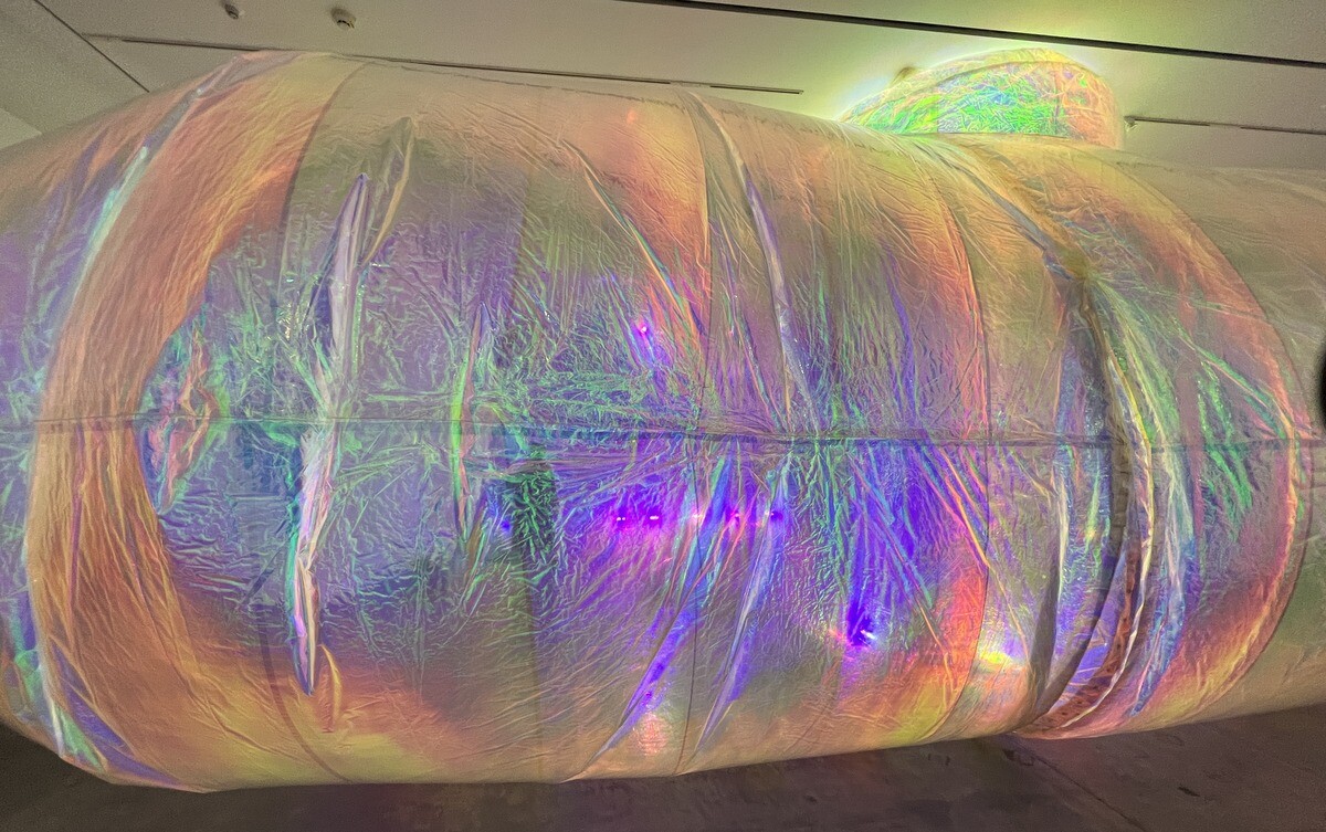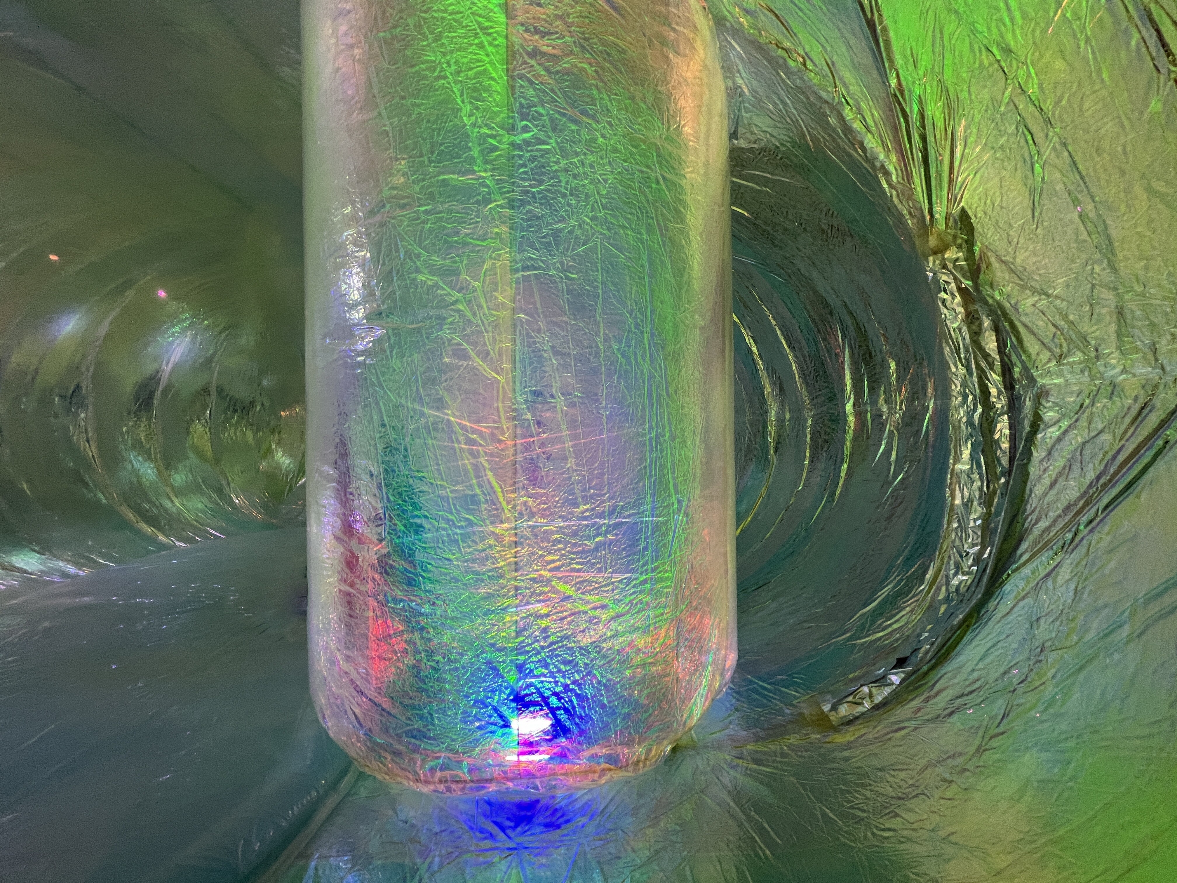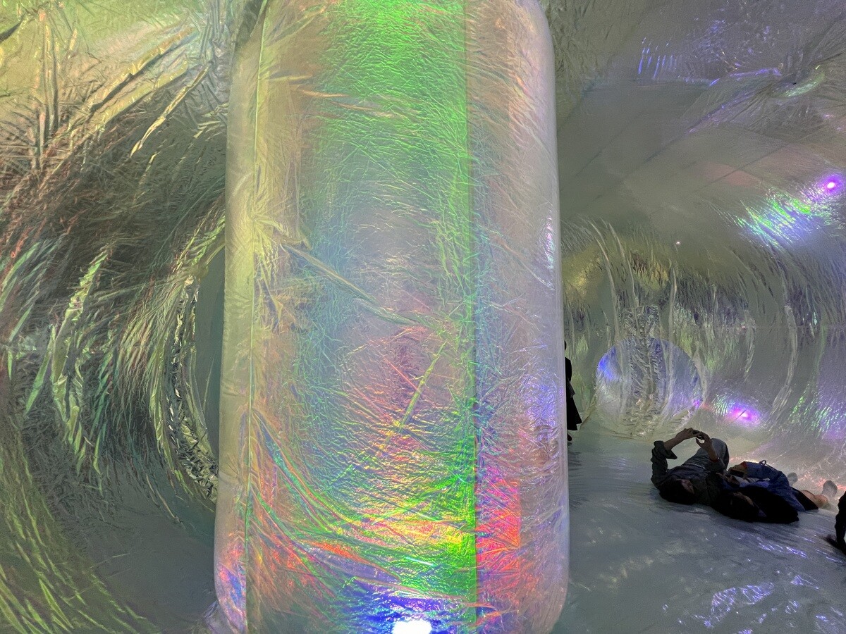 さまざまな色に変化するバルーンの作品の内側に、右の細い入口から入ることが出来る。