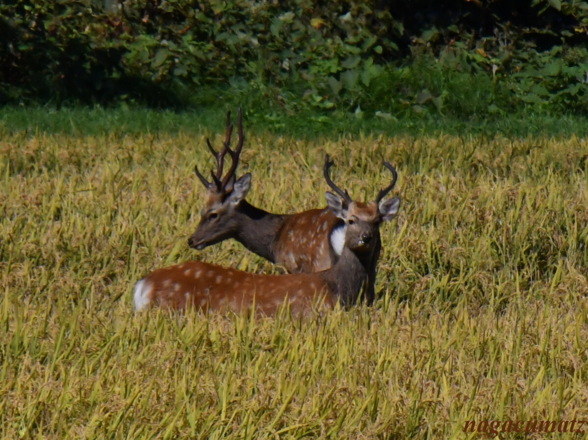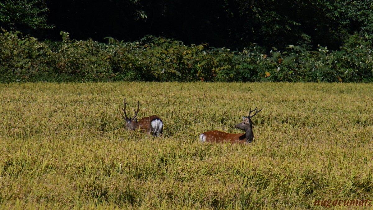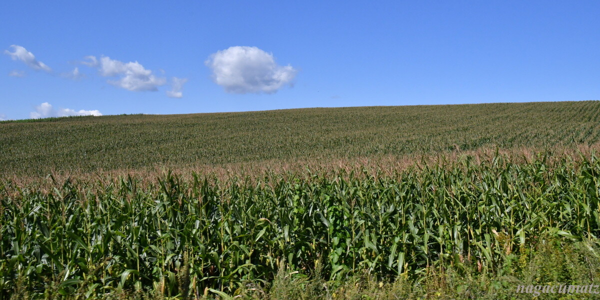 収穫前のお米やトウモロコシ畑が広がる。