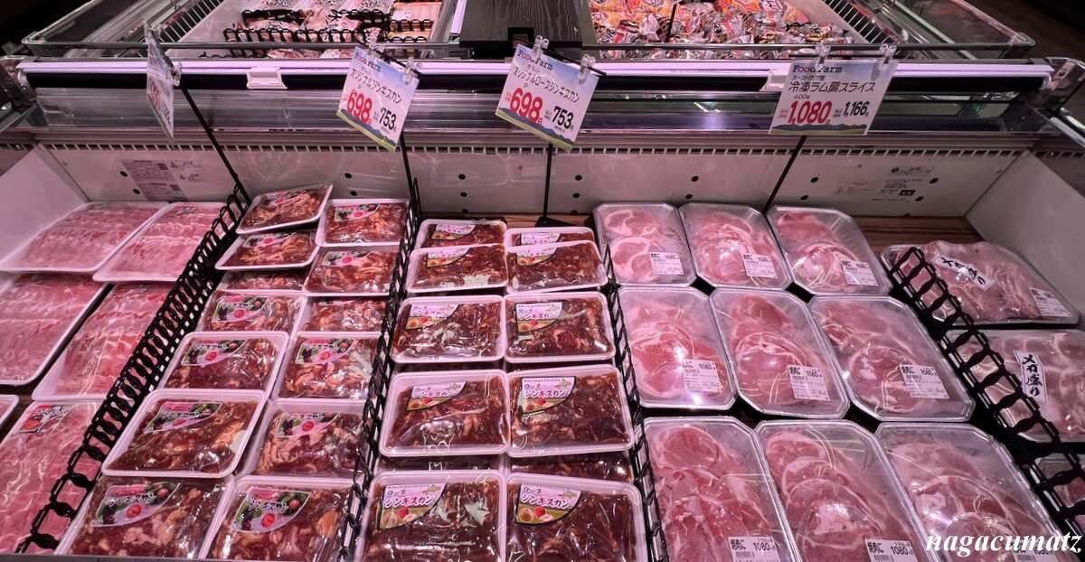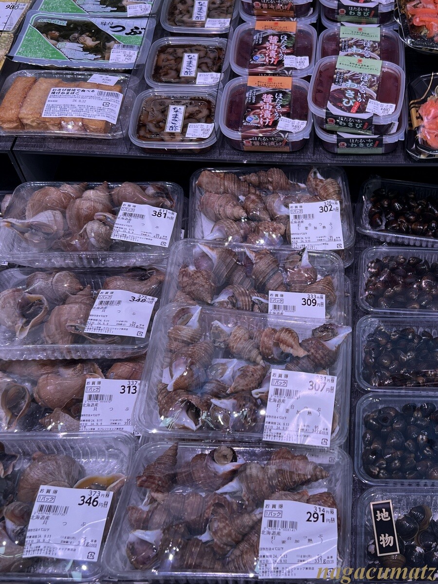 スーパーでは、ジンギスカンやつぶ貝など、北海道らしい食材が色々と。