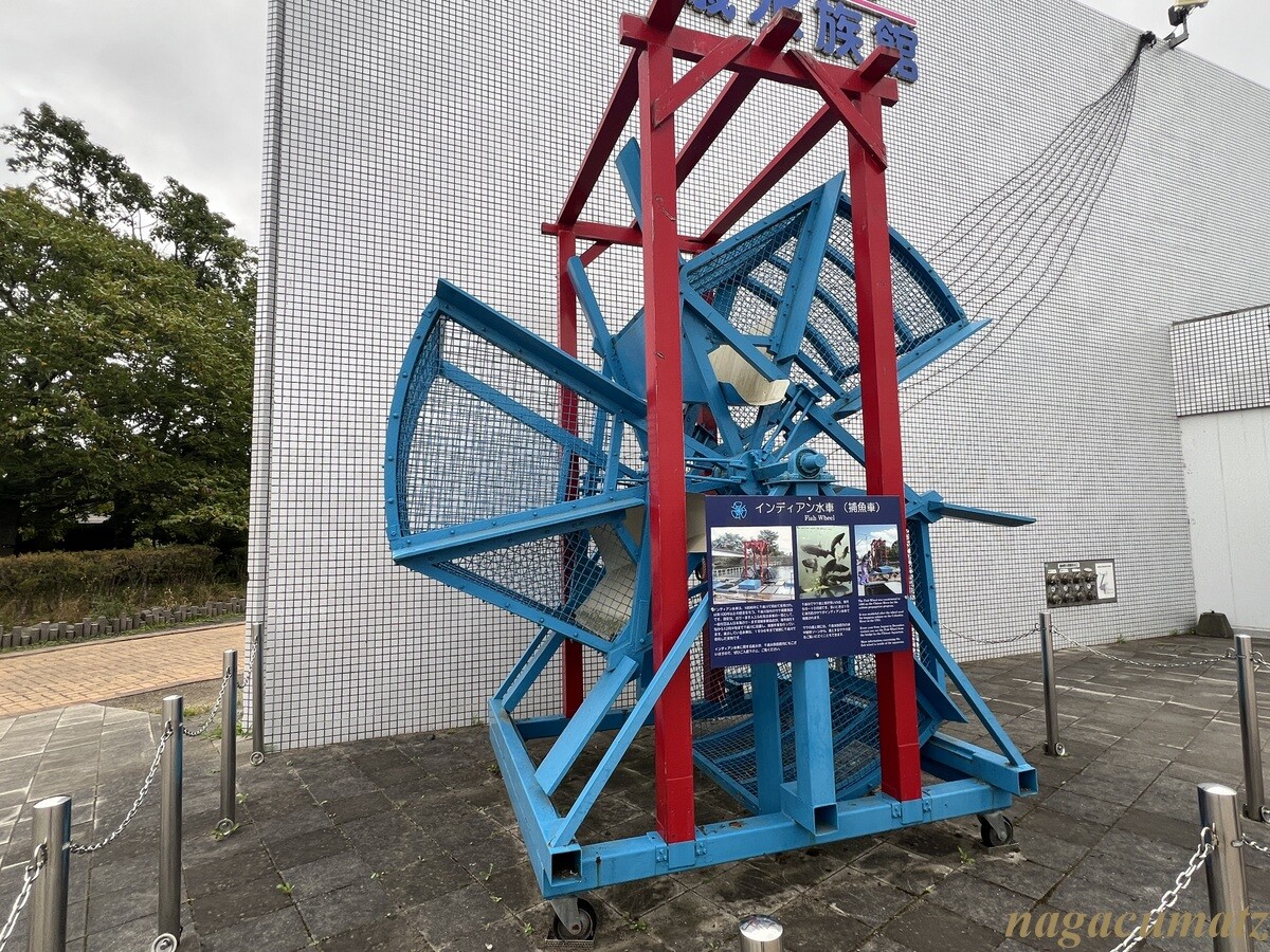 インディアン水車 水車の籠に鮭が入ると、水力による回転で水揚げされる仕組みの捕魚車。