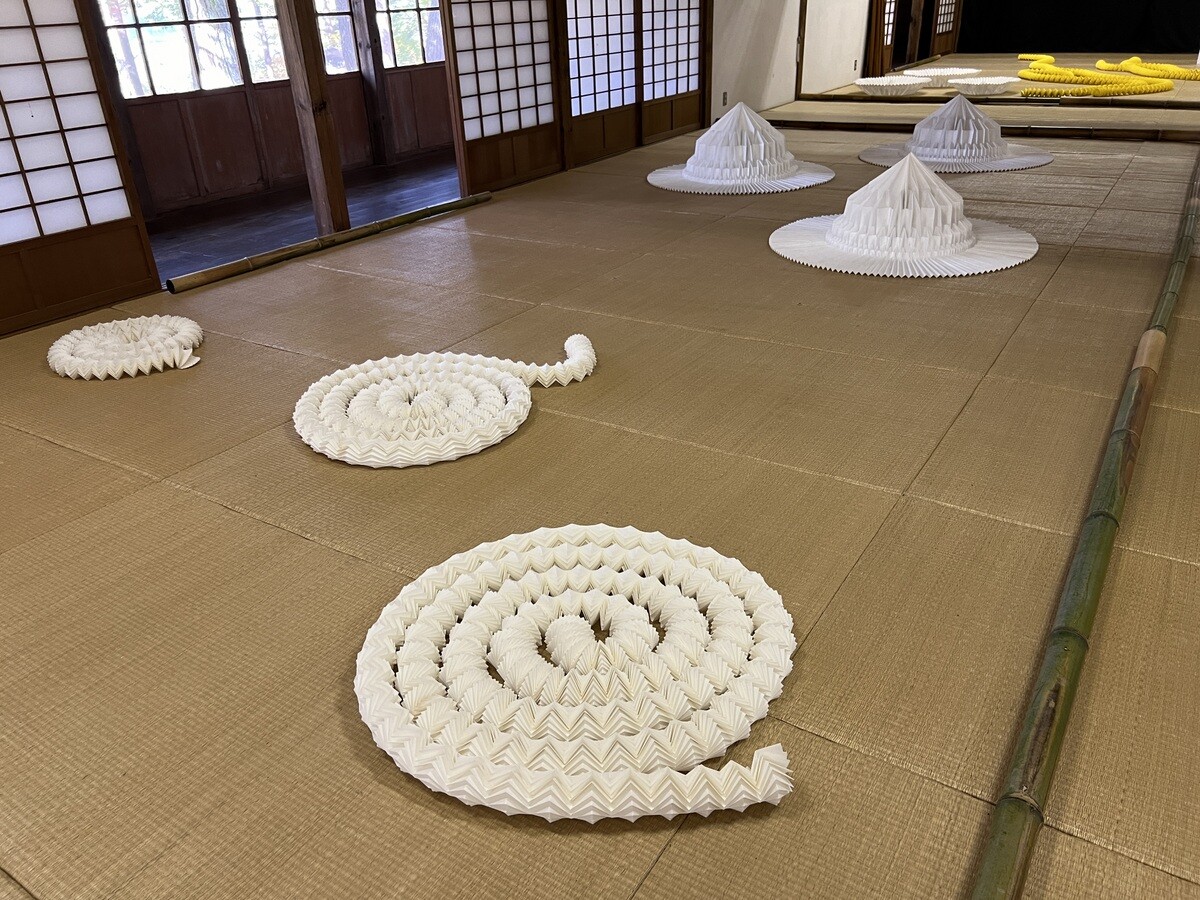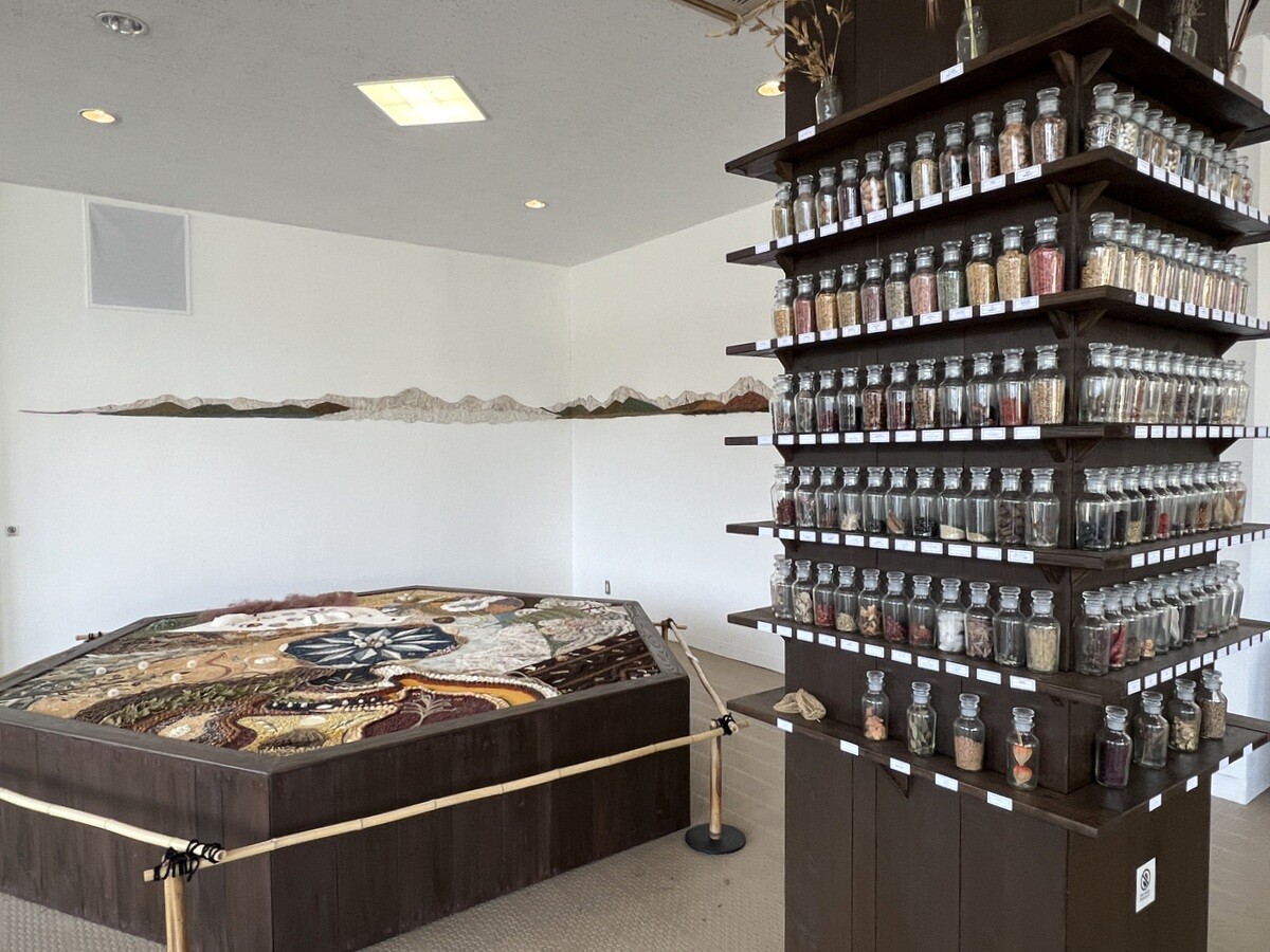 食から見える人々の暮らしを、小さな種から広がる視点で表現した作品。菜種、野沢菜、りんご、花豆など160種の植物素材が使われている。会期後は、そのまま自然に返されるのだそう。