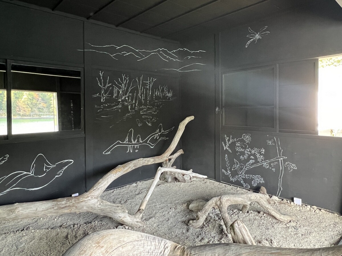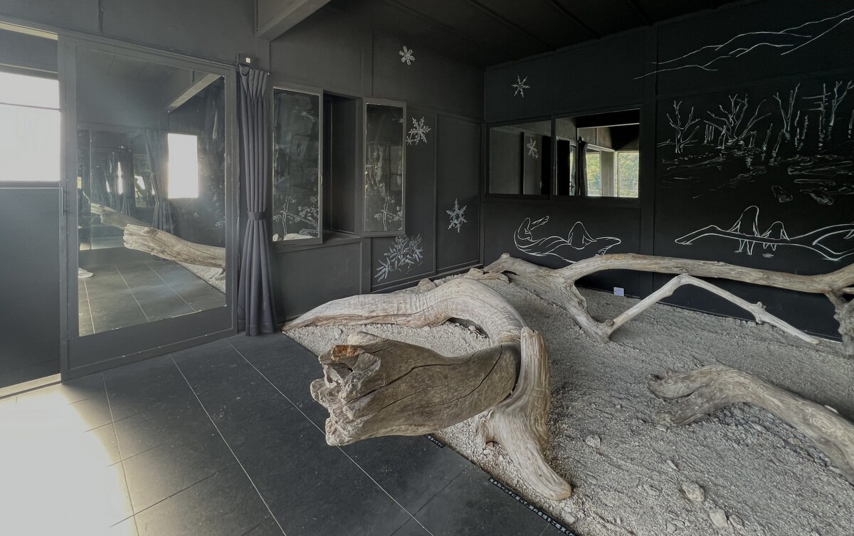 中央付近の一本の柱の1面だけ赤く塗装されている。現実の森林・林業・木材の関係は良い循環になっていないとの警告からなのだそう。