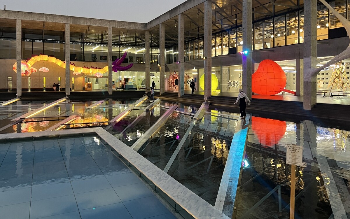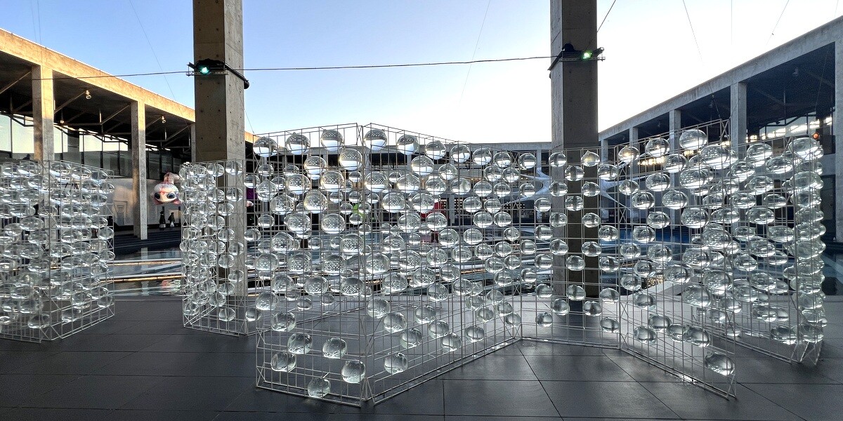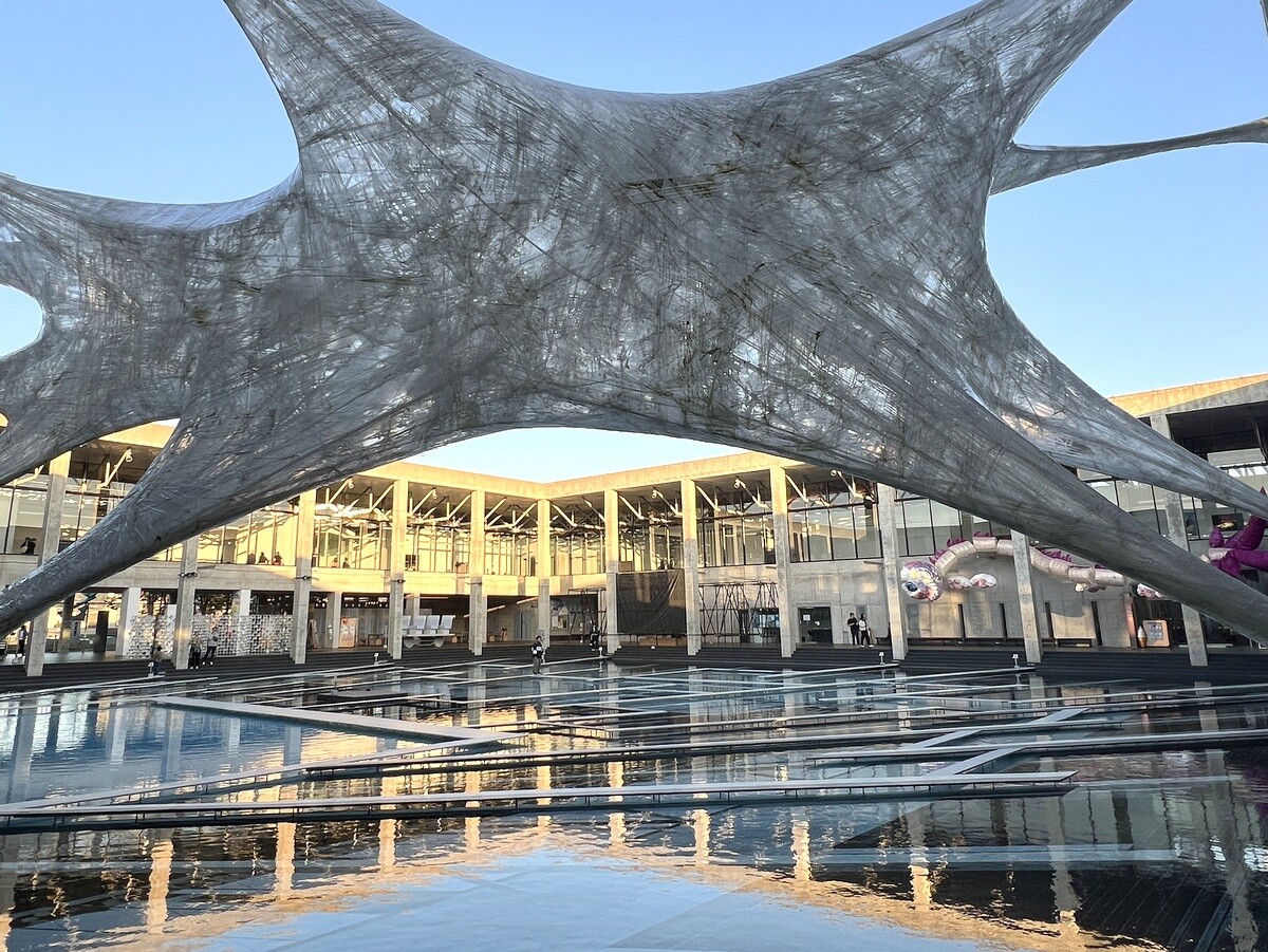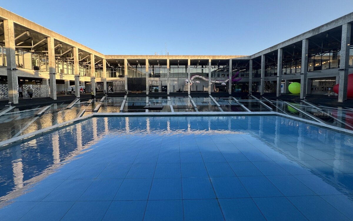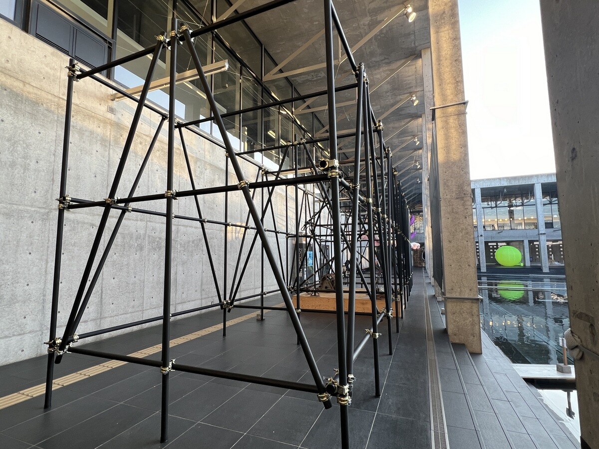 レアンドロ・エルリッヒ氏のトリックアート「Palimpsest 空の池」の上に、放射状に伸びる柱のイメージの上に水上歩道が配置されて、阿弥陀籤を歩いているような感じに。