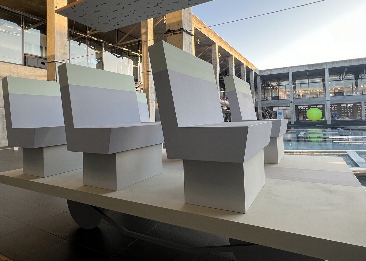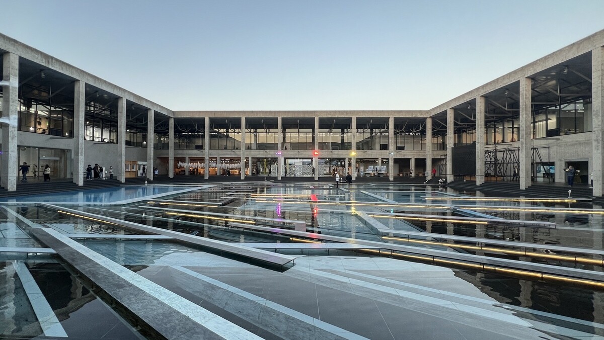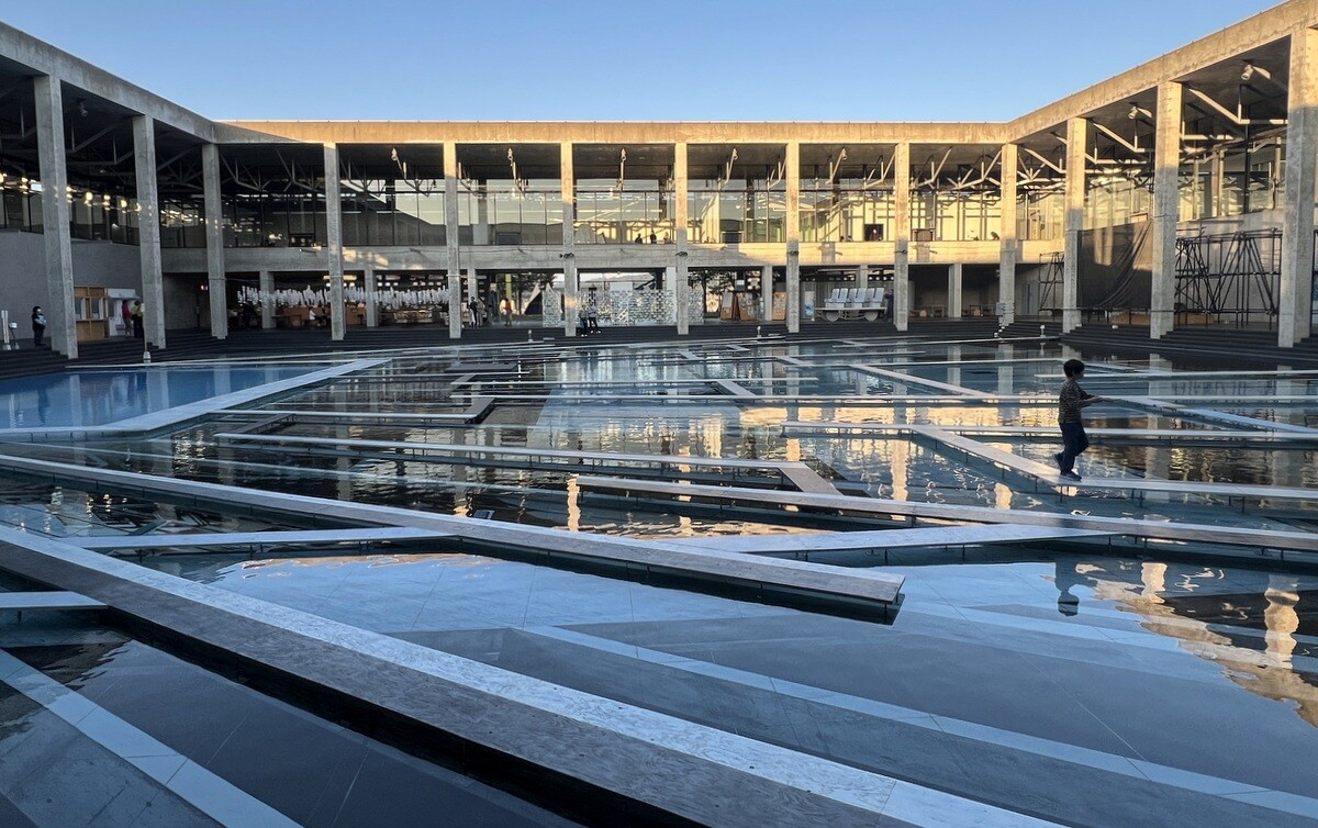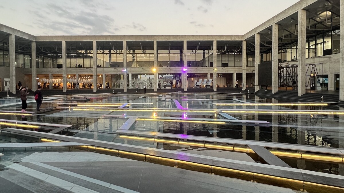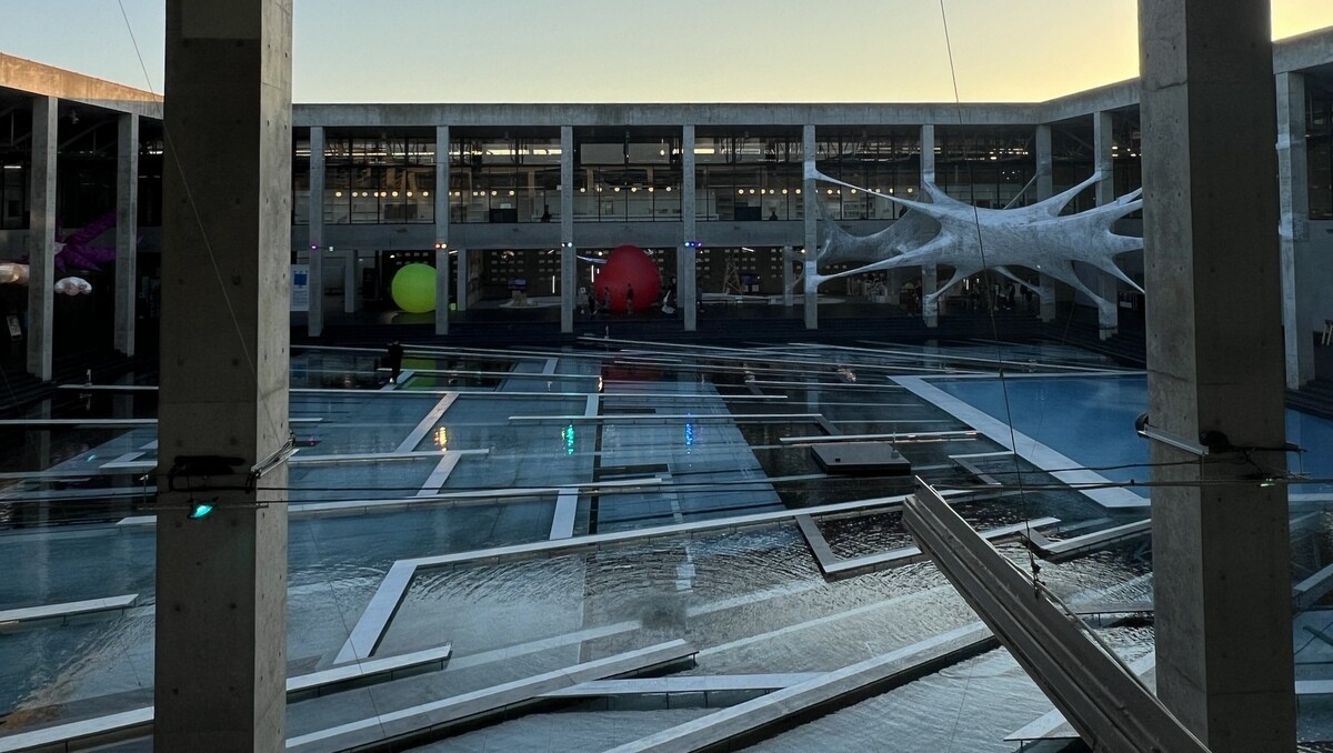 レアンドロ・エルリッヒ氏のトリックアート「Palimpsest 空の池」の上に、放射状に伸びる柱のイメージの上に水上歩道が配置されて、阿弥陀籤を歩いているような感じに。