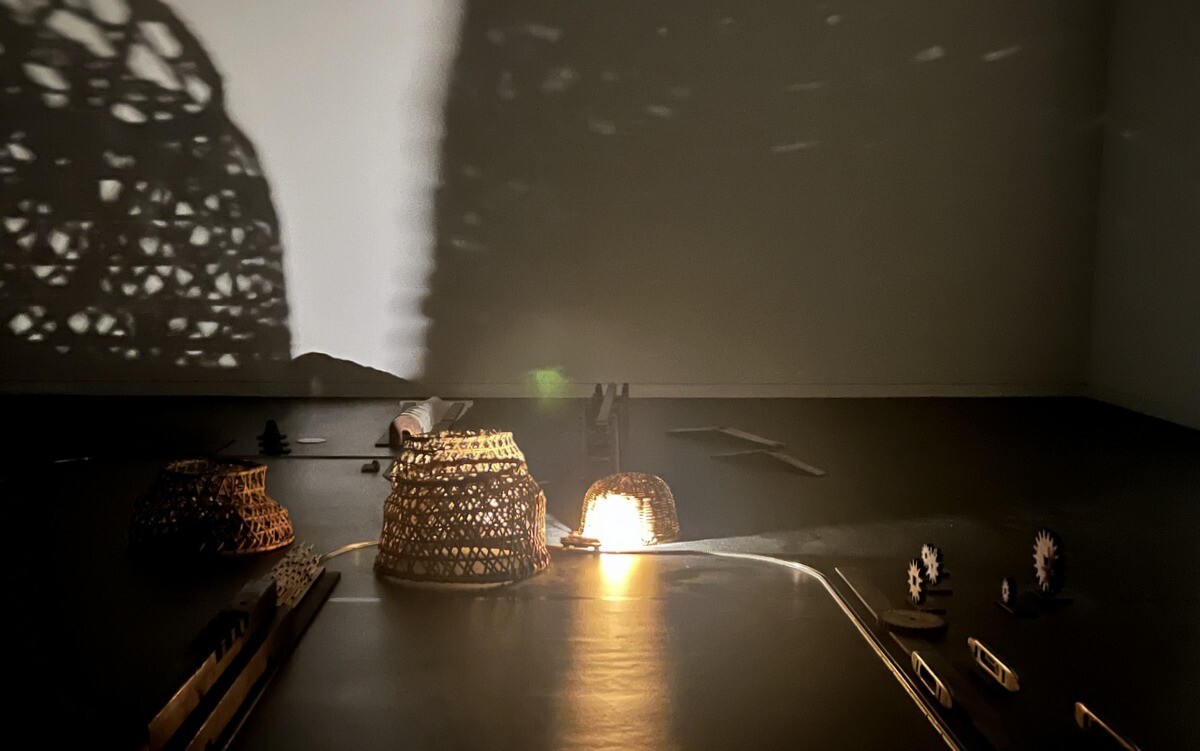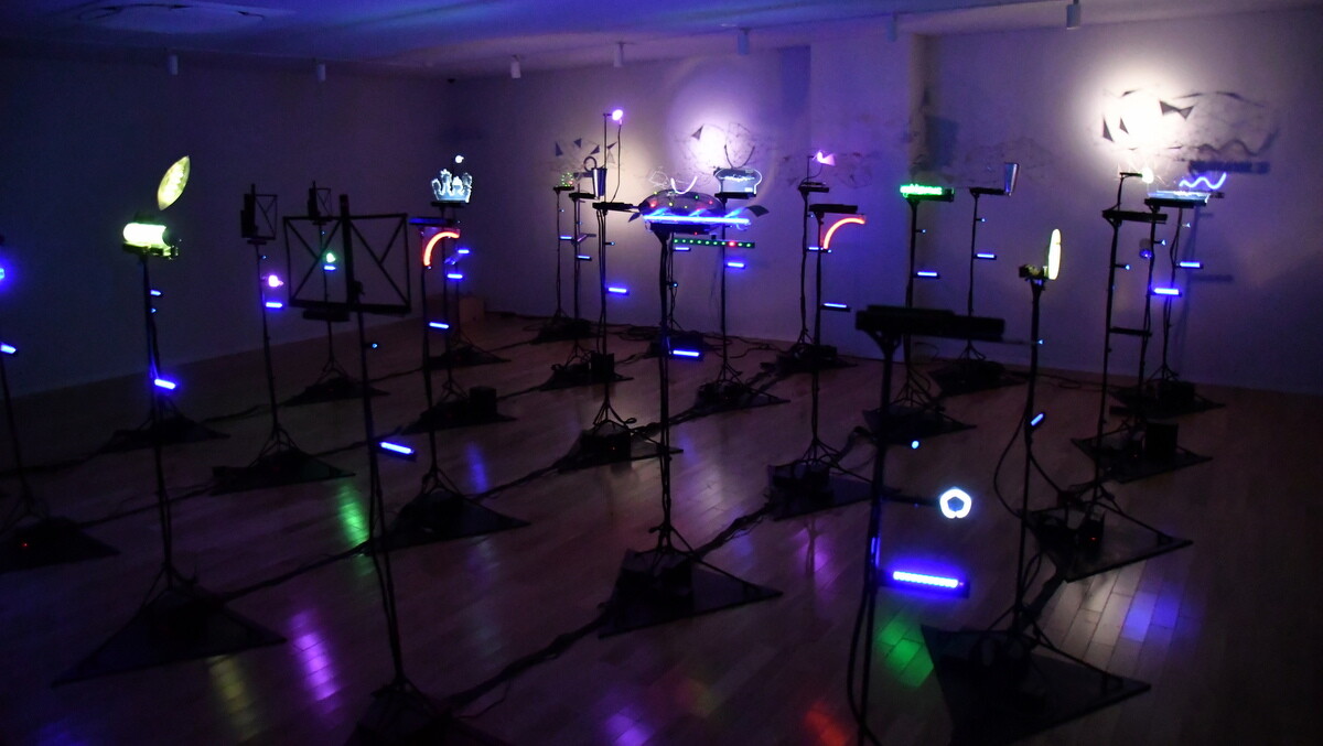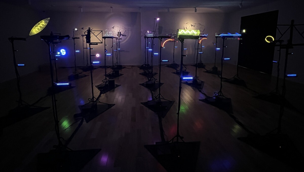 25の譜面台の上の光源とオブジェが明滅する作品は、1995年に発表され、復元されたもの。