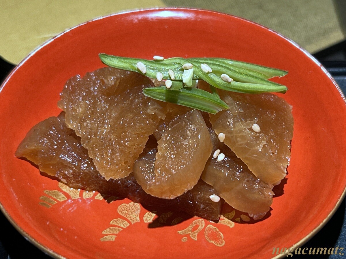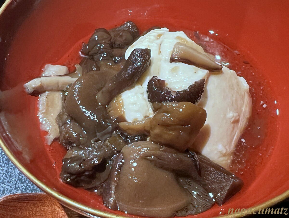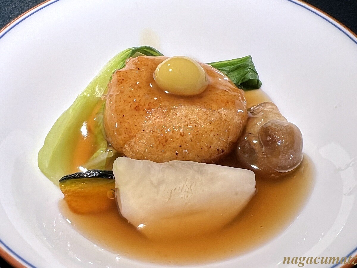 凍り餅まんじゅうのあんかけ 凍り餅と豆腐を合わせた生地の中には黒豆などが入っていて、揚げた外側のカリッと感と中のもちもち感が良い感じで美味しい。