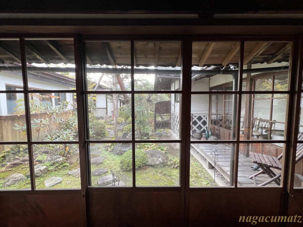 中庭の向こうにある離れには、北アルプス国際芸術祭の エカテリーナ・ムロムツェワ Ekaterina Muromtseva 「山のくちぶえ」が展示されていた。その様子は:
