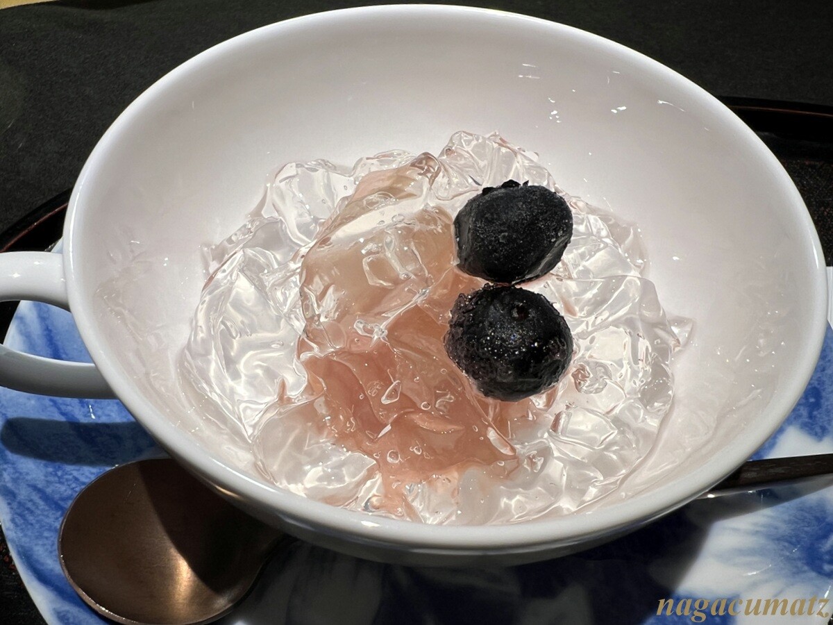 水ゼリー 本当に甘味も何も足していない水だけのゼリーの下には、林檎のコンポート、上にはブルーベリー。