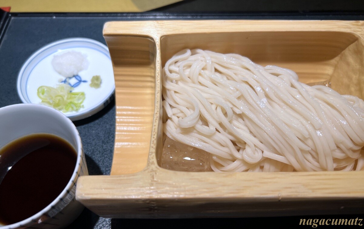 信州では昔、長い麺を総称して「長々(おさおさ)」と呼んでいたことに端を発し、今でも「おざざ」「ざざ」と呼んでいるとのこと。信州=お蕎麦と言うイメージを持っていたが、戸隠など山岳地方は蕎麦で、大町など平野部分ではうどんを食べるそうで、県産地の小麦である「ユメセイキ」と「ハナマンテン」のブレンドを使用しているとのこと。