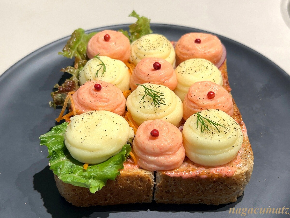 ポテトの下には、オニオンスライスとキャロットラペが敷かれている。ランチセット 好きなオープンサンド2種類・サラダ・ティーフリーで2500円