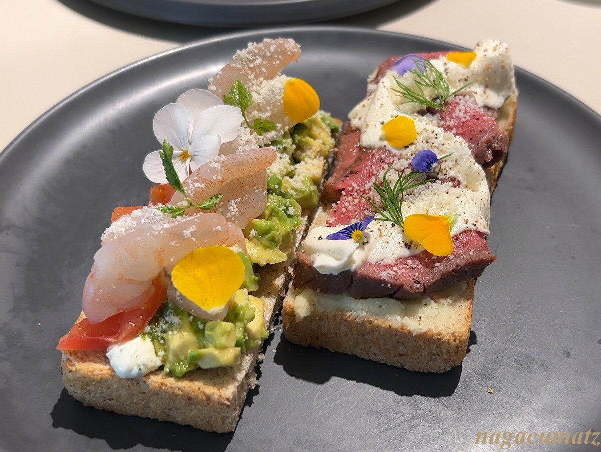 ローストビーフ、サーモン、エビアボカドの3種類からの選択で、ローストビーフとエビアボカドを選択。とても綺麗に丁寧に作られている。