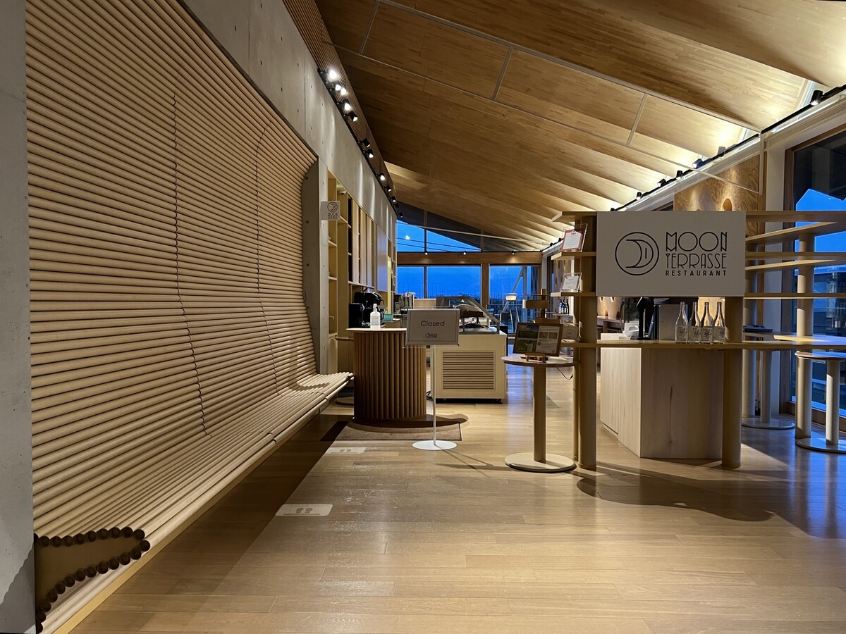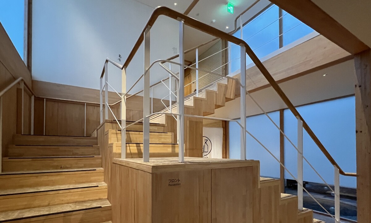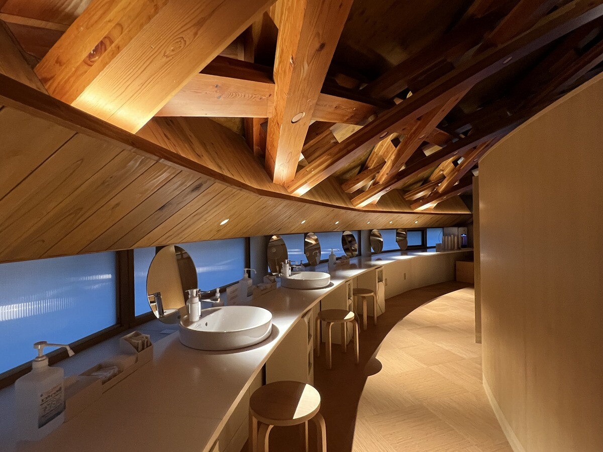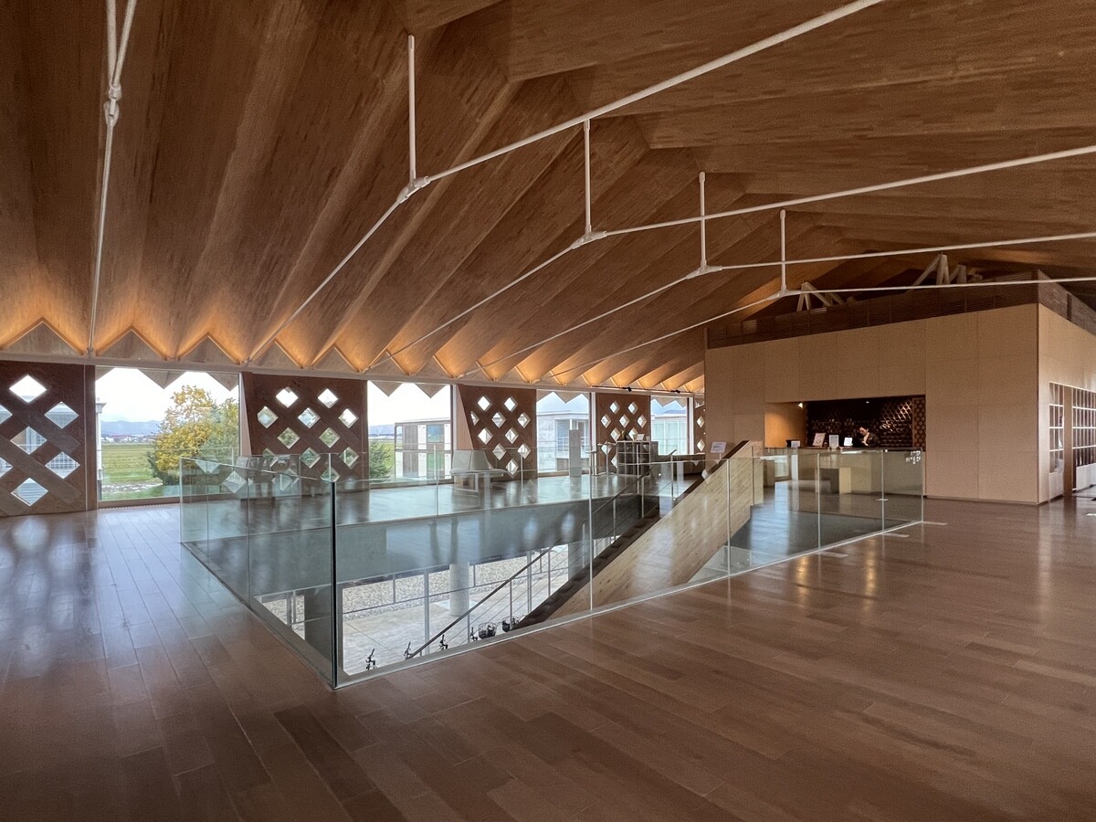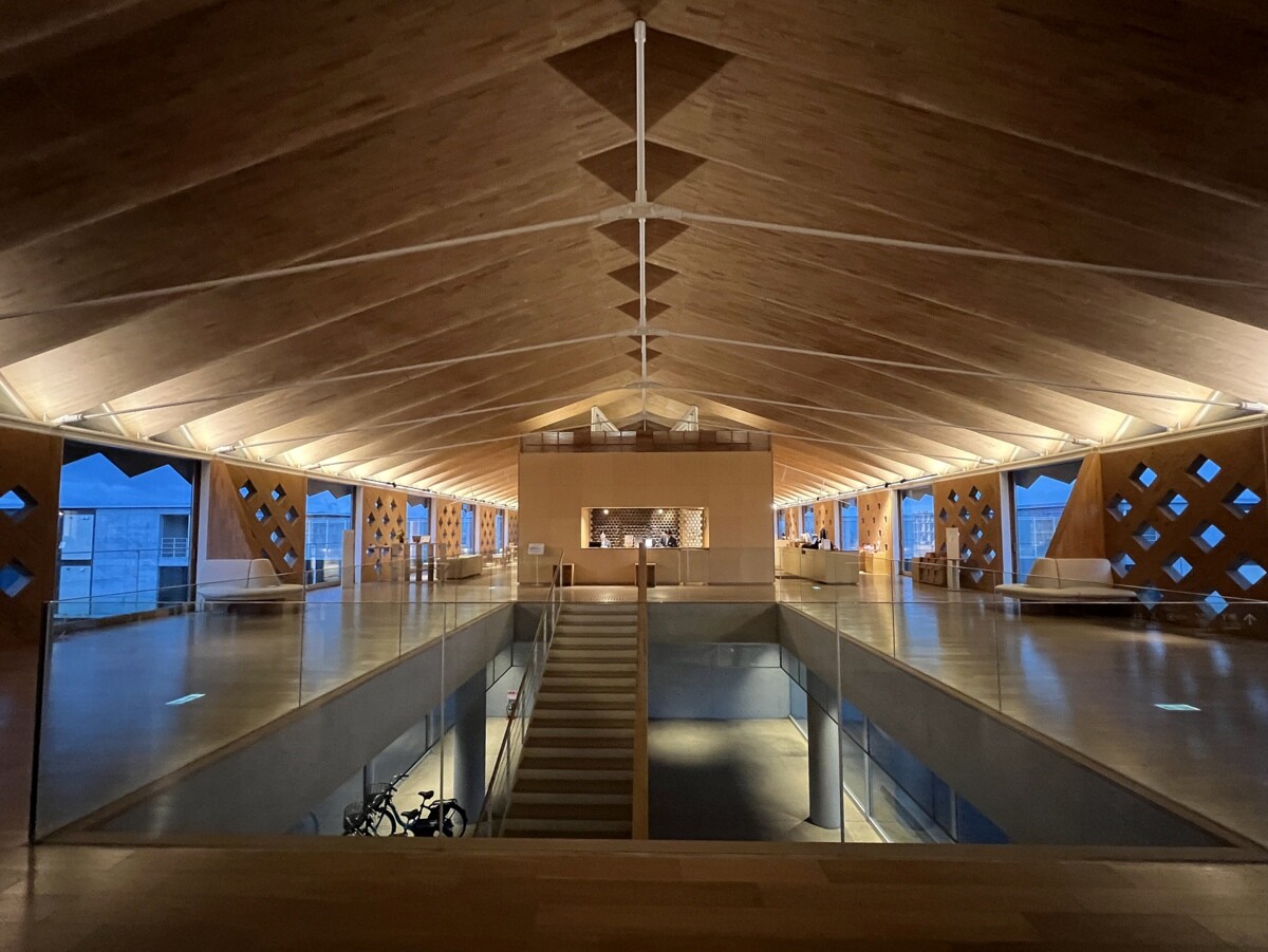 共用棟にあるフロント。折半構造という屋根を蛇腹状に組み合わせて強度を増す構造として、可能な限り柱を排除した空間となっている。