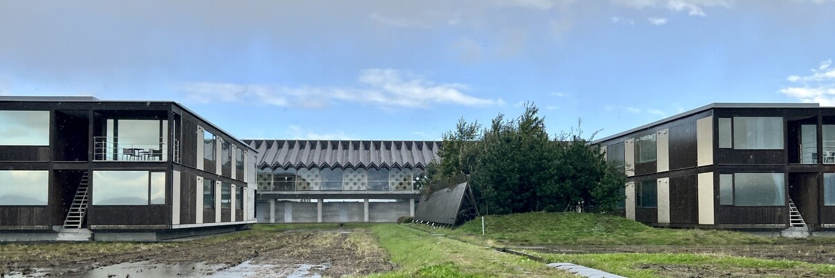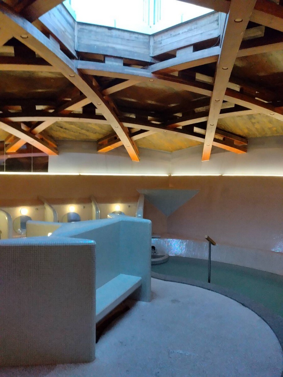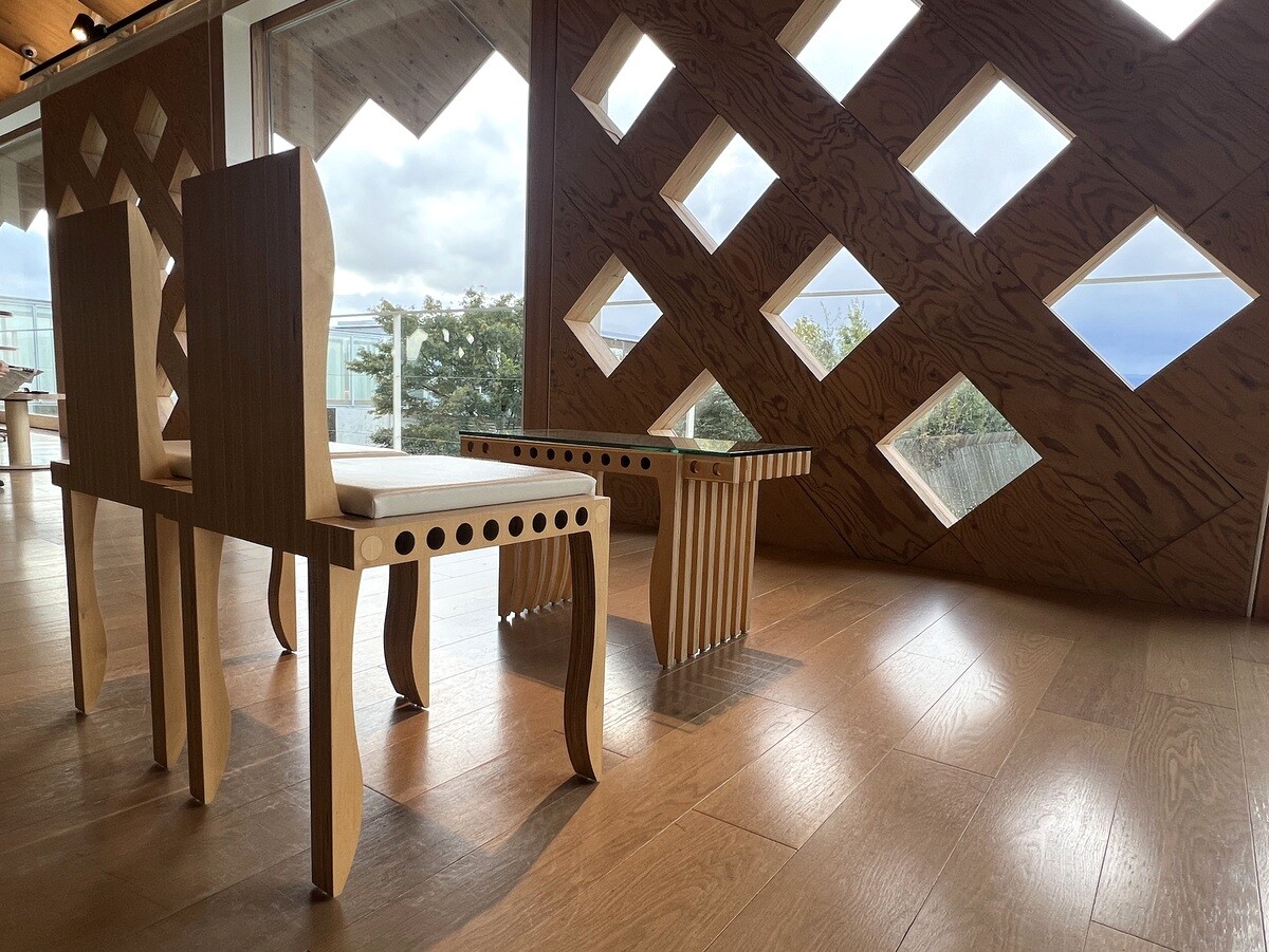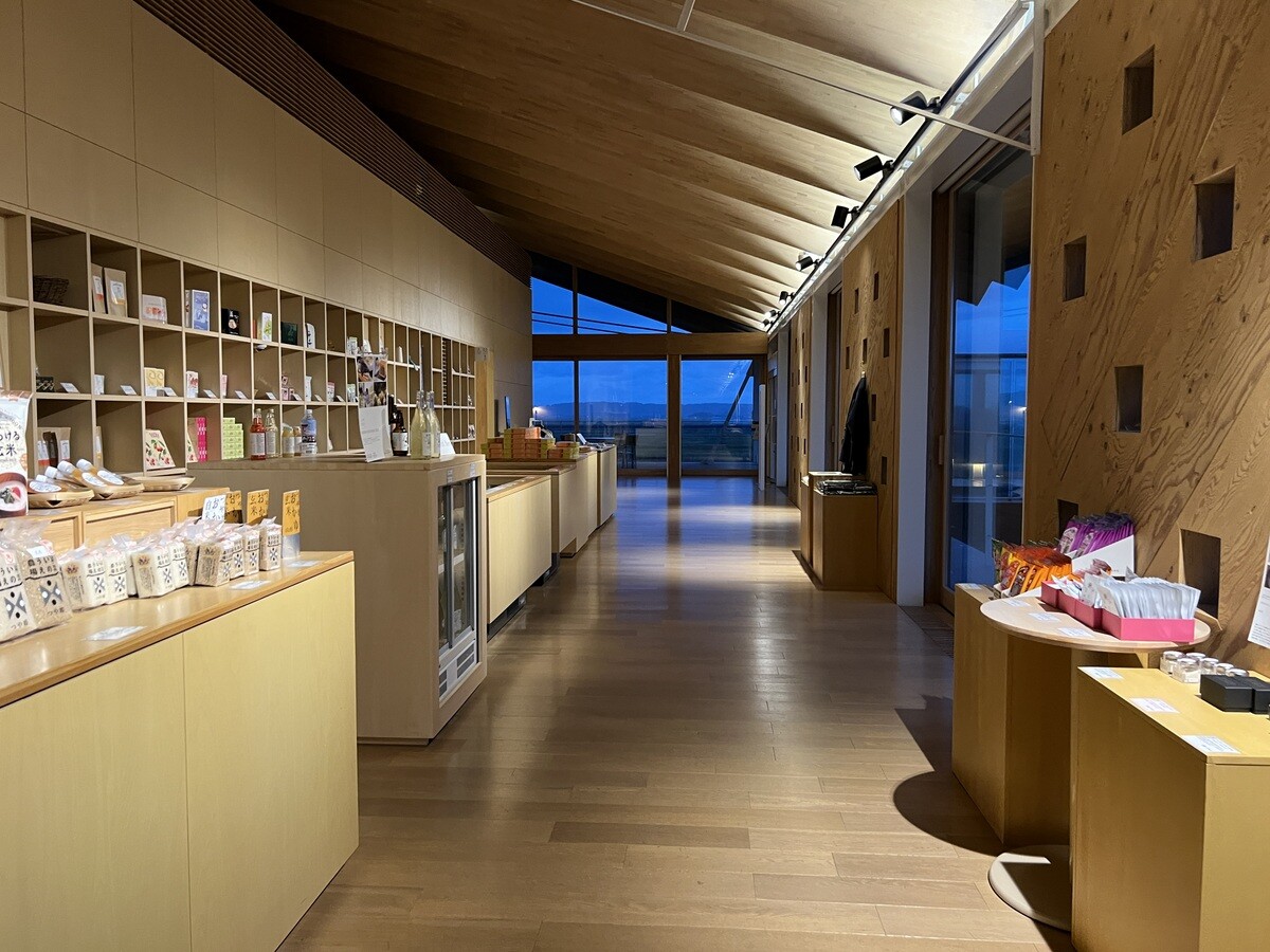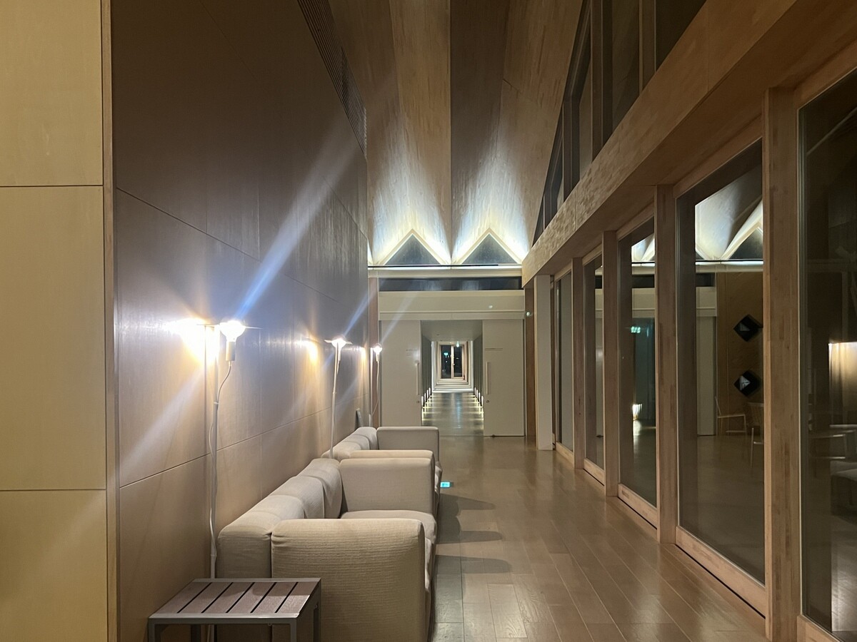 共用棟にあるフロント。折半構造という屋根を蛇腹状に組み合わせて強度を増す構造として、可能な限り柱を排除した空間となっている。