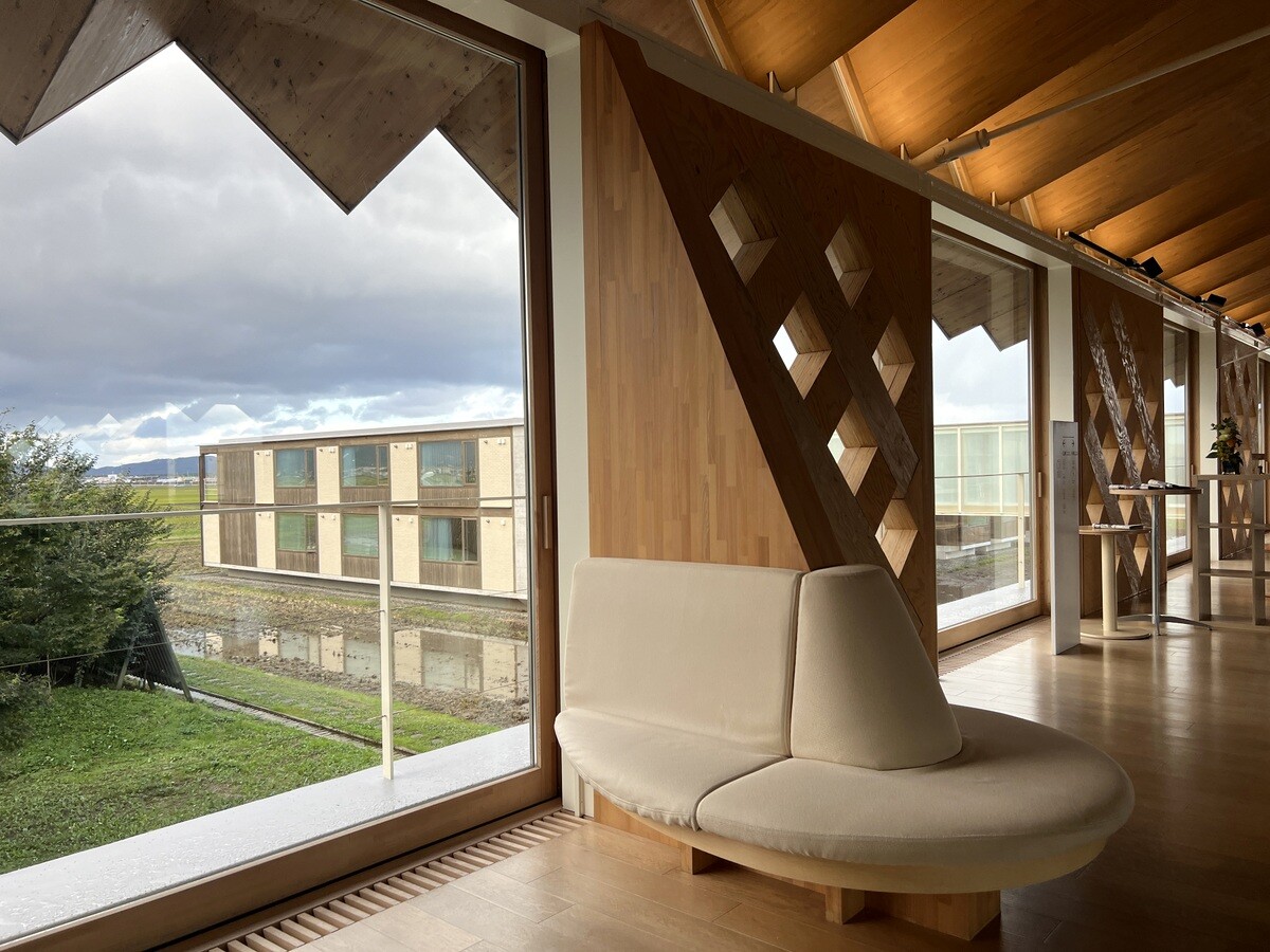 「晴耕雨読の時を過ごす、田んぼに浮かぶホテル」がコンセプトのスイデンテラス。しかしある側面では、水田はメタンガスの排出などが課題となっていて、環境負荷の要因になることを否定できないことから、2024年度の「サスティナブルチャレンジ 2024」の取り組みとして、敷地内にある水田の一部で水を張らない稲栽培を実施することとされたのだそう。水田に映り込む建物をイメージしていたので、あれれ?と💦