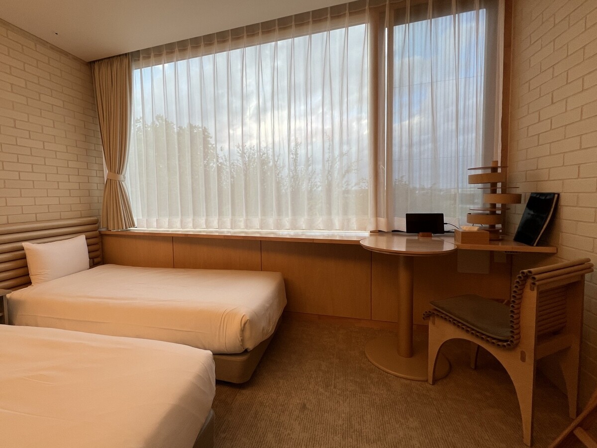 約150室の客室は水田の中に、2階建の3つの棟に分かれている。