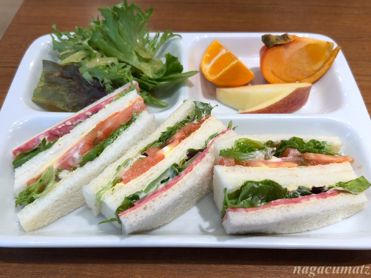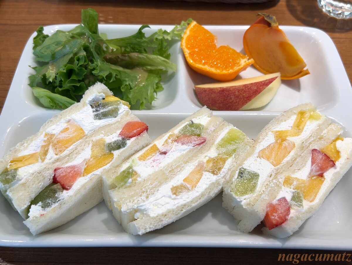サンドの中には、イチゴ、キウイ、パイナップル、マンゴーがたっぷり入っていて、サイドには林檎、柿、みかんとサラダが付く。美味しい。