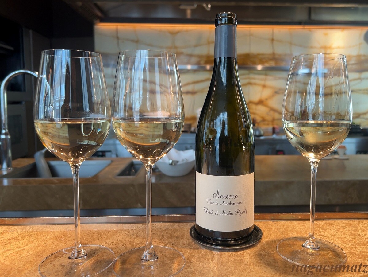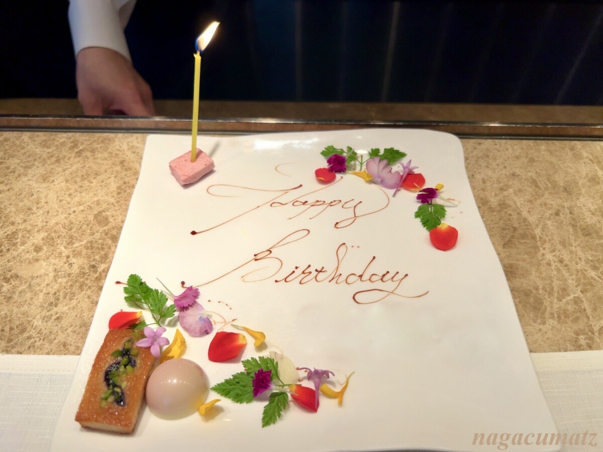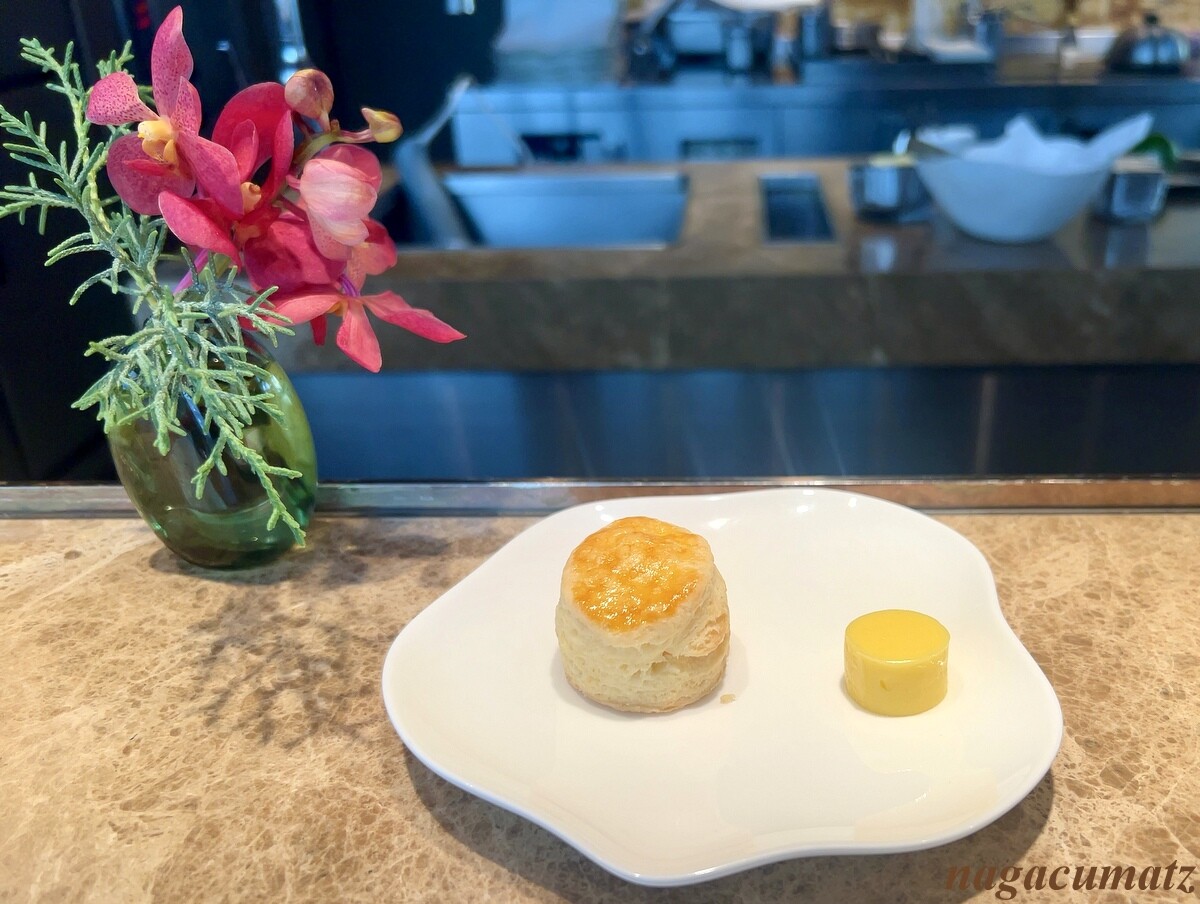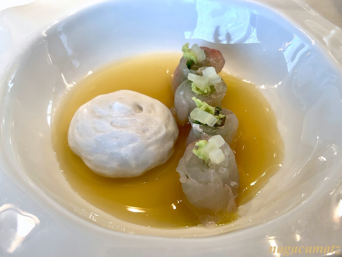 ヒラメか鮪の選択で、ヒラメを。カルパッチョとなっていて、左にはココナッツのクリーム、その場で少し酸味のある青リンゴのソースをかけて下さる。