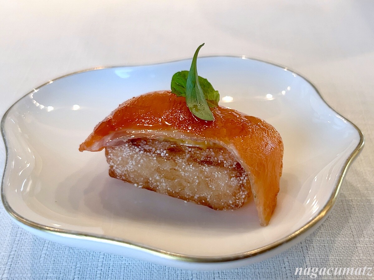 酢飯と米粉を混ぜて揚げたシャリに信州サーモン。上にはチポトレ(メキシコ料理やテクス・メクス料理の香辛料で、熟した唐辛子を乾燥させてから煙で燻製にしたもの)のマヨネーズにミントとパクチーが載る。シャリ部分がもっちりしていて、お餅のような食感。